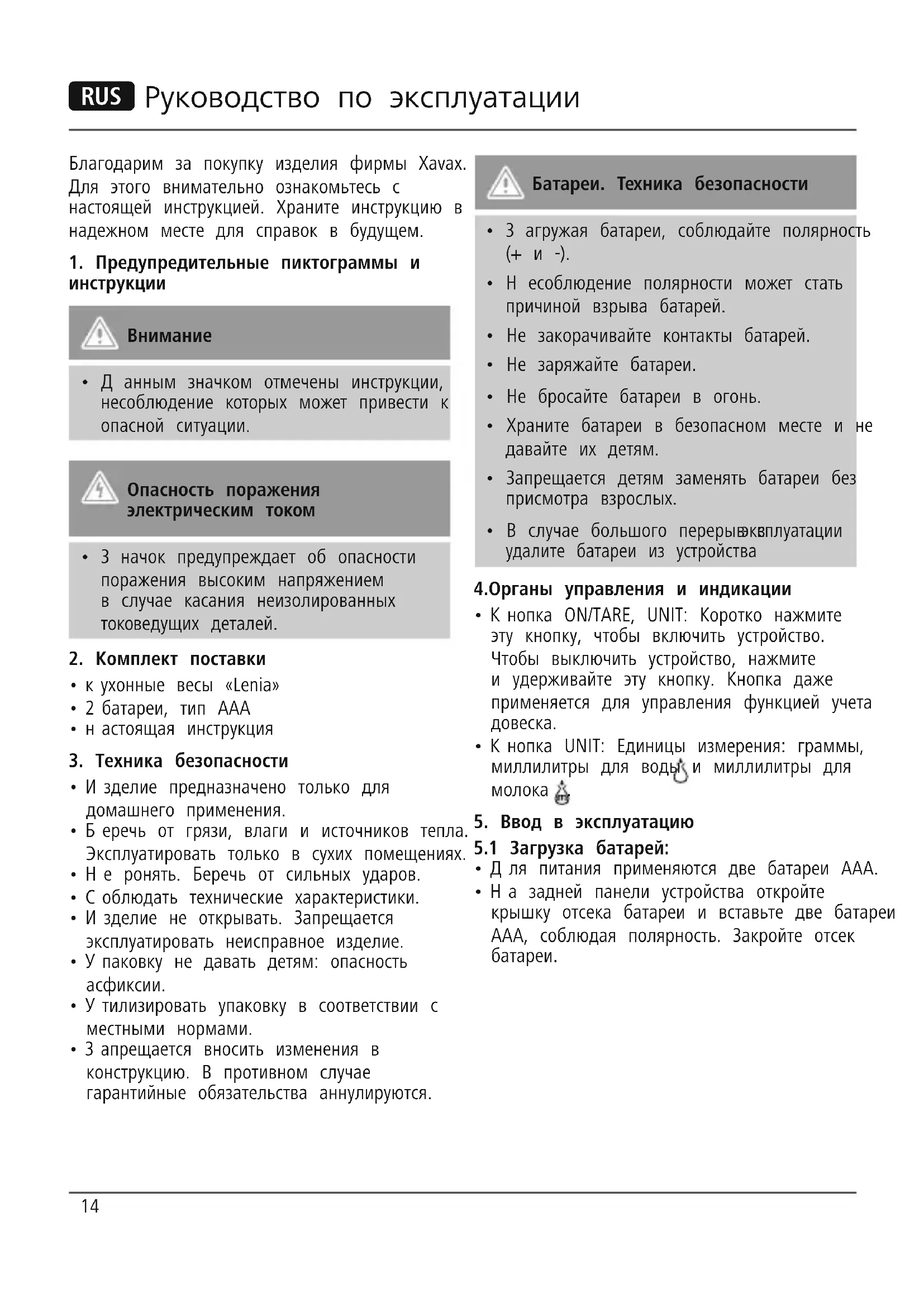 Охрана окружающей среды: С момента перехода национального законодательства на европейские нормативы 2002/96/EU и 2006/66/EU действительно следующее: Электрические и электронные приборы, а также батареи запрещается утилизировать с обычным мусором. Потребитель, согласно закону, обязан утилизировать электрические и электронные приборы, а также батареи и аккумуляторы после их использования в специально предназначенных для этого пунктах сбора, либо в пунктах продажи. Детальная регламентация этих требований осуществляется соответствующим местным законодательством. Необходимость соблюдения данных предписаний обозначается особым значком на изделии, инструкции по эксплуатации или упаковке. При переработке, повторном использовании материалов или при другой форме утилизации бывших в употреблении приборов Вы помогаете охране окружающей среды. В соответствии с предписаниями по обращению с батареями, в Германии вышеназванные нормативы действуют для утилизации батарей и аккумуляторов.17 I Istruzioni per l‘uso Grazie per avere acquistato un prodotto Xavax! Prima della messa in esercizio, leggete attentamente le seguenti istruzioni e avvertenze. quindi conservatele in un luogo sicuro per una eventuale consultazione.
