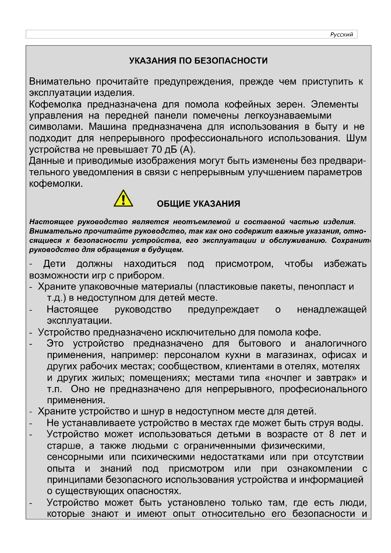 ОБЩИЕ УКАЗАНИЯ Настоящее руководство является неотъемлемой и составной частью изделия. Внимательно прочитайте руководство, так как оно содержит важные указания, отно- сящиеся к безопасности устройства, его эксплуатации и обслуживанию. Сохраните руководство для обращения в будущем. - Дети должны находиться под присмотром, чтобы избежать возможности игр с прибором. - Храните упаковочные материалы (пластиковые пакеты, пенопласт и т.д.) в недоступном для детей месте. - Настоящее руководство предупреждает о ненадлежащей эксплуатации. - Устройство предназначено исключительно для помола кофе. - Это устройство предназначено для бытового и аналогичного применения, например: персоналом кухни в магазинах, офисах и других рабочих местах; сообществом, клиентами в отелях, мотелях и других жилых; помещениях; местами типа «ночлег и завтрак» и т.п. Оно не предназначено для непрерывного, професионального применения. - Храните устройство и шнур в недоступном месте для детей. - Не устанавливаете устройство в местах где может быть струя воды. - Устройство может использоваться детьми в возрасте от 8 лет и старше, а также людьми с ограниченными физическими, сенсорными или психическими недостатками или при отсутствии опыта и знаний под присмотром или при ознакомлении с принципами безопасного использования устройства и информацией о существующих опасностях. - Устройство может быть установлено только там, где есть люди, которые знают и имеют опыт относительно его безопасности игигиены. - Производитель не несет ответственности за несанкционированное вмешательство в какой-либо из компонентов устройства. - Чистка и техническое обслуживание не должны проводиться детьми без присмотра. - Любая эксплуатация, отличная от описанной выше, является эксплу- атацией не по назначению и может представлять опасность; производитель не несет ответственности за ущерб, причиненный в результате ненадлежащей эксплуатации устройства. - Производитель не несет ответственности за использование нео- ригинальных запасных частей и/или аксессуаров. - Производитель не несет ответственности за ремонт, выполненный неуполномоченными сервисными центрами. - Запрещается оставлять устройство без присмотра и пользоваться им вне помещения. - Не допускайте нахождения прибора под воздействием атмосферных явлений (дождь, солнце, мороз). - Не мойте устройство под струей воды и не погружайте его в воду. - Избегайте контакта с движущимися частями. - Перед включением, проверьте бункер на наличие посторонних