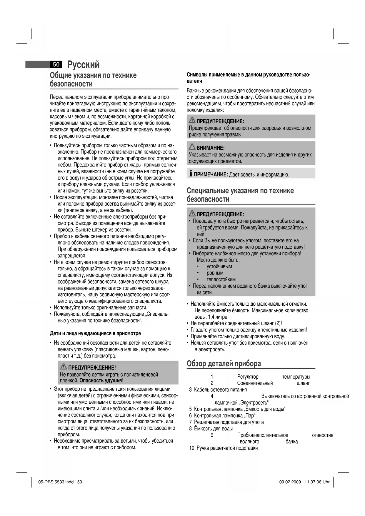- Нельзя оставлять утюг без присмотра, если он включён в электросеть. Обзор деталей прибора 1 Регулятор температуры 2 Соединительный шланг 3 Кабель сетевого питания 4 Выключатель со встроенной контрольной лампочкой „Электросеть“ 5 Контрольная лампочка „Ёмкость для воды“ 6 Контрольная лампочка „Пар“ 7 Решётчатая подставка для утюга 8 Ёмкость для воды 9 Пробка/наполнительное отверстие водяного бачка 10 Ручка решётчатой подставки 05-DBS 5533.indd 5005-DBS 5533.indd 50 09.02.2009 11:37:06 Uhr09.02.2009 11:37:06 UhrРусский