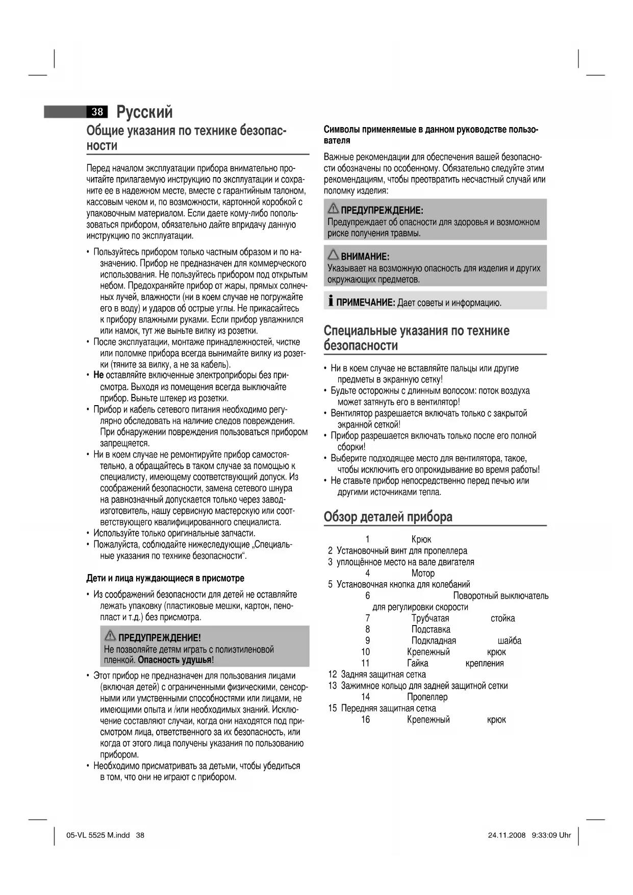 - Не ставьте прибор непосредственно перед печью или другими источниками тепла. Обзор деталей прибора 1 Крюк 2 Установочный винт для пропеллера 3 уплощённое место на вале двигателя 4 Мотор 5 Установочная кнопка для колебаний 6 Поворотный выключатель для регулировки скорости 7 Трубчатая стойка 8 Подставка 9 Подкладная шайба 10 Крепежный крюк 11 Гайка крепления 12 Задняя защитная сетка 13 Зажимное кольцо для задней защитной сетки 14 Пропеллер 15 Передняя защитная сетка 16 Крепежный крюк 05-VL 5525 M.indd 3805-VL 5525 M.indd 38 24.11.2008 9:33:09 Uhr24.11.2008 9:33:09 UhrРусский