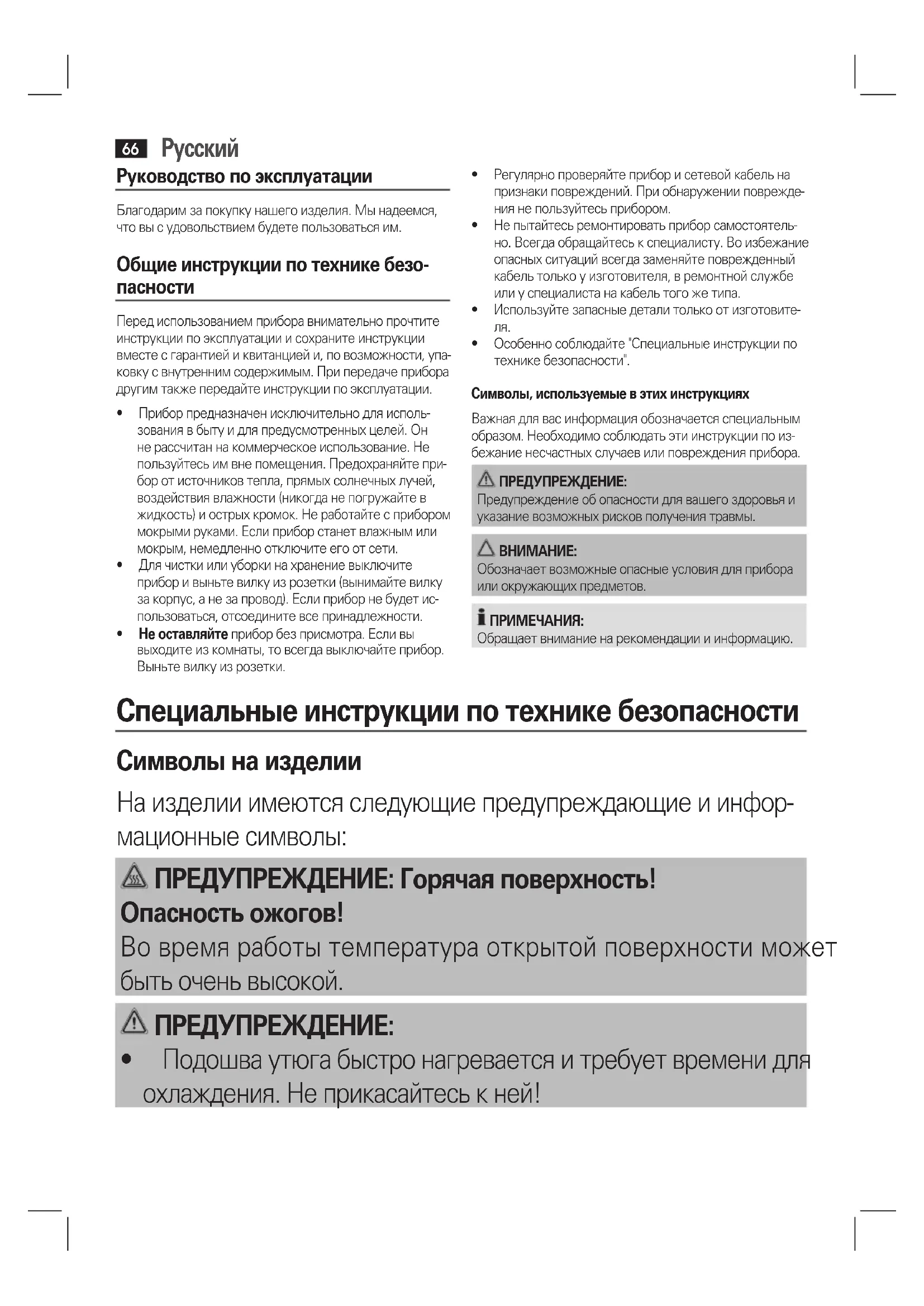 - Особеннособлюдайте"Специальныеинструкциипотехнике безопасности".Символы, используемые в этих инструкцияхВажнаядлявасинформацияобозначаетсяспециальнымобразом. Необходимо соблюдать эти инструкции по из-бежаниенесчастныхслучаевилиповрежденияприбора. ПРЕДУПРЕЖДЕНИЕ:Предупреждение об опасности для вашего здоровья и указаниевозможныхрисковполучениятравмы. ВНИМАНИЕ:Обозначаетвозможныеопасныеусловиядляприбораили окружающих предметов. ПРИМЕЧАНИЯ:Обращает внимание на рекомендации и информацию. Специальные инструкции по технике безопасности Символы на изделии На изделии имеются следующие предупреждающие и инфор- мационныесимволы: ПРЕДУПРЕЖДЕНИЕ: Горячая поверхность! Опасность ожогов! Вовремяработытемператураоткрытойповерхностиможет бытьоченьвысокой. ПРЕДУПРЕЖДЕНИЕ: