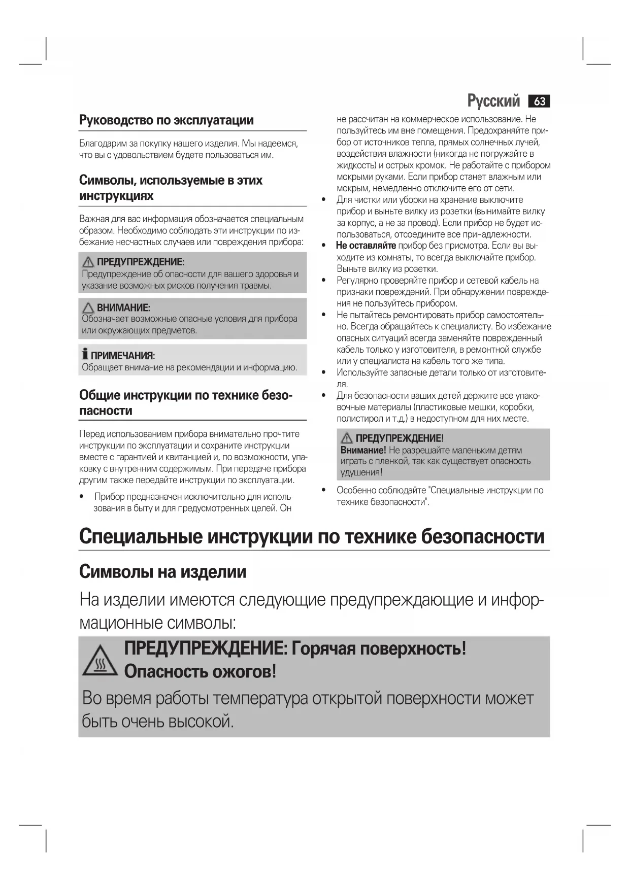 - Длябезопасностивашихдетейдержитевсеупако-вочныематериалы(пластиковыемешки,коробки,полистирол и т.д.) в недоступном для них месте. ПРЕДУПРЕЖДЕНИЕ!Внимание! Не разрешайте маленьким детям играть с пленкой, так как существует опасность удушения!• Особеннособлюдайте"Специальныеинструкциипотехнике безопасности". Специальные инструкции по технике безопасности Символы на изделии На изделии имеются следующие предупреждающие и инфор- мационныесимволы: ПРЕДУПРЕЖДЕНИЕ: Горячая поверхность! Опасность ожогов! Вовремяработытемператураоткрытойповерхностиможет бытьоченьвысокой.Русский