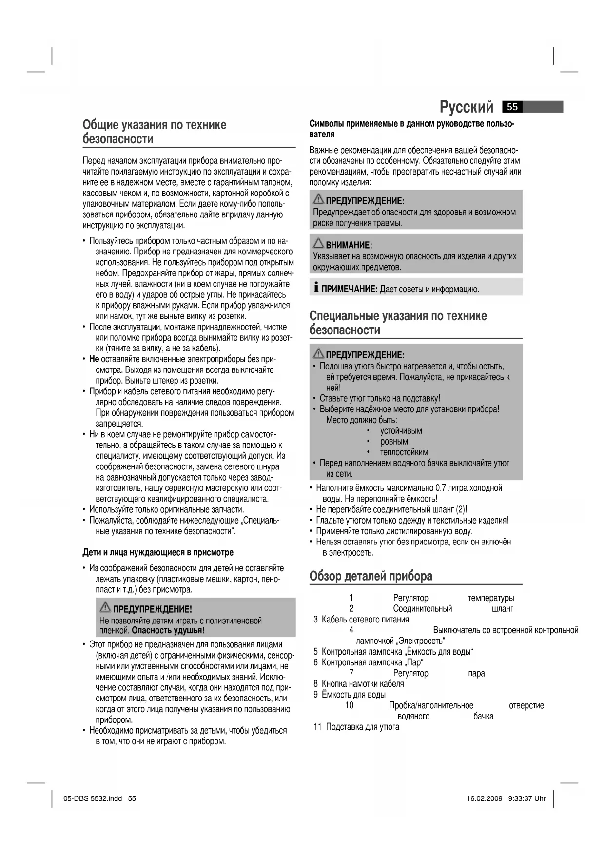 - Нельзя оставлять утюг без присмотра, если он включён в электросеть. Обзор деталей прибора 1 Регулятор температуры 2 Соединительный шланг 3 Кабель сетевого питания 4 Выключатель со встроенной контрольной лампочкой „Электросеть“ 5 Контрольная лампочка „Ёмкость для воды“ 6 Контрольная лампочка „Пар“ 7 Регулятор пара 8 Кнопка намотки кабеля 9 Ёмкость для воды 10 Пробка/наполнительное отверстие водяного бачка 11 Подставка для утюга 05-DBS 5532.indd 5505-DBS 5532.indd 55 16.02.2009 9:33:37 Uhr16.02.2009 9:33:37 UhrРусский