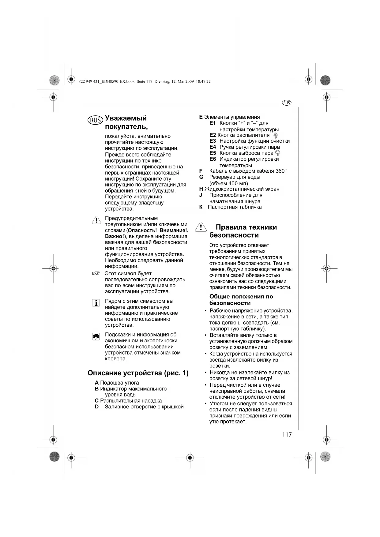 - Утюгом не следует пользоваться если после падения видны признаки повреждения или если утю протекает.822 949 431_EDB8590-EX.book Seite 117 Dienstag, 12. Mai 2009 10:47 22u