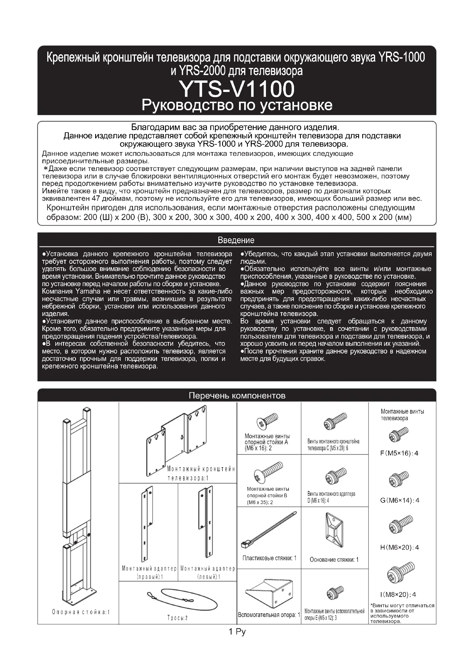 Gebruik de schroefgaten aan de achterkant van de TV-montagebeugel om de meegeleverde draden aan vast te maken.(De installatiepositie hangt mede af van het model televisie en/of de hoogte. Installeer de draden aan de hand van de gebruikte televisie.) Gebruik in de handel verkrijgbare schroeven om de draden goed vast te zetten aan een wand of balk die sterk genoeg is om het gewicht van de televisie te dragen.(Selecteer schroeven die geschikt zijn voor het soort wand.)Wees voorzichtig dat er geen kabels klem komen te zitten tussen de wand en het meubel wanneer u het meubel tegen de wand plaatst.Bevestigingsschroeven voor de TV-montagebeugelBevestigingsschroeven voor de TV-montagebeugelTV-montagebeugel Installeer dit meubel op een plek die stevig genoeg is. U moet het meubel met de televisie tegen een wand plaatsen en maatregelen treffen om te voorkomen dat het om kan vallen. Als hier geen maatregelen tegen worden genomen, kan het meubel met de televisie omvallen, hetgeen kan leiden tot letsel en/of schade.10 Ne EInformatie voor gebruikers van inzameling en verwijdering van oude apparaten. Dit teken op de producten, verpakkingen en/of bijgaande documenten betekent dat gebruikte elektrische en elektronische producten niet mogen worden gemengd met algemeen huishoudelijk afval. Breng alstublieft voor de juiste behandeling, herwinning en hergebruik van oude producten deze naar daarvoor bestemde verzamelpunten, in overeenstemming met uw nationale wetgeving en de instructies 2002/96/ EC. Door deze producten juist te rangschikken, helpt u het redden van waardevolle rijkdommen en voorkomt u mogelijke negatieve effecten op de menselijke gezondheid en de omgeving, welke zich zou kunnen voordoen door ongepaste afvalverwerking. Voor meer informatie over het inzamelen en hergebruik van oude producten kunt u contact opnemen met uw plaatselijke gemeente, uw afvalverwerkingsbedrijf of het verkooppunt waar u de artikelen heeft gekocht. [Informatie over verwijdering in ander landen buiten de Europese Unie] Dit symbool is alleen geldig in de Europese Unie. Mocht u artikelen weg willen gooien, neem dan alstublieft contact op met uw plaatselijke overheidsinstantie of dealer en vraag naar de juiste manier van verwijderen. Informatie voor gebruikers van inzameling en verwijdering van oude apparaten Informatie voor gebruikers van inzameling en verwijdering van oude apparaten Gebruiken van de extra steun MeubelExtra steunSteunzuil Let op Waarschuwing Wanneer u achter de televisie moet schoonmaken of de bedrading moet veranderen en het meubel tijdelijk van de wand moet halen, moet u erop letten dat u het meubel optilt wanneer u het verplaatst, waarna u de extra steun moet vastmaken aan de steunzuil. Bevestigingsschroeven voor de extra steun (3)Bewaar de extra steun en de bijbehorende bevestigingsschroeven zodat u ze opnieuw kunt gebruiken, wanneer u het meubel tijdelijk van de wand moet halen om erachter schoon te maken of om de bedrading te veranderen.*Maak de extra steun vast met de drie bijbehorende bevestigingsschroeven.De extra steun is geen garantie dat het meubel helemaal niet om kan vallen onder speciale omstandigheden, zoals wanneer er tegen gestoten wordt, of bij een aardbeving o.i.d. Gebruik de extra steun niet om het meubel permanent te ondersteunen op een plek waar het niet door een wand wordt gesteund.㲇㲨㲧㲩㲦㲙㲸㩷㲪㲫㲧㲢㲣㲙㪑㩷㪈Вспомогательная опора: 1㲅㲧㲦㲫㲙㲟㲦㲴㲢㩷㲣㲩㲧㲦㲱㲫㲞㲢㲦㩷㲫㲞㲤㲞㲛㲡㲠㲧㲩㲙㪑㩷㪈F䋨M5×16)䋺䋴H䋨M6×20)䋺䋴Монтажные винты телевизораI䋨M8×20)䋺䋴㲅㲧㲦㲫㲙㲟㲦㲴㲢㩷㲙㲝㲙㲨㲫㲞㲩㩷㩿㲨㲩㲙㲛㲴㲢㪀㪑㩷㪈㲅㲧㲦㲫㲙㲟㲦㲴㲢㩷㲙㲝㲙㲨㲫㲞㲩㩷㩿㲤㲞㲛㲴㲢㪀㪑㩷㪈㲋㲩㲧㲪㲴㪑㩷㪉 YTS-V1100 YTS-V1100 Руководство по установке Руководство по установке 㪪㪬㪩㪩㪦㪬㪥㪛㩷㪪㪦㪬㪥㪛㩷㪫㪭㩷㪪㪫㪘㪥㪛䇭㪰㪩㪪㪄㪈㪇㪇㪇㪃㪰㪩㪪㪄㪉㪇㪇㪇↪㩷ოነ䈞㊄ౕ 㪪㪬㪩㪩㪦㪬㪥㪛㩷㪪㪦㪬㪥㪛㩷㪫㪭㩷㪪㪫㪘㪥㪛䇭㪰㪩㪪㪄㪈㪇㪇㪇㪃㪰㪩㪪㪄㪉㪇㪇㪇↪㩷ოነ䈞㊄ౕ Благодарим вас за приобретение данного изделия. Данное изделие представляет собой крепежный кронштейн телевизора для подставки окружающего звука YRS-1000 и YRS-2000 для телевизора. G䋨M6×14)䋺䋴Пластиковые стяжки: 1Основание стяжки: 1 Перечень компонентов 1 Py Крепежный кронштейн телевизора для подставки окружающего звука YRS-1000 Крепежный кронштейн телевизора для подставки окружающего звука YRS-1000 и YRS-2000 для телевизора и YRS-2000 для телевизора Данное изделие может использоваться для монтажа телевизоров, имеющих следующие присоединительные размеры. Даже если телевизор соответствует следующим размерам, при наличии выступов на задней панели телевизора или в случае блокировки вентиляционных отверстий его монтаж будет невозможен, поэтому перед продолжением работы внимательно изучите руководство по установке телевизора.Имейте также в виду, что кронштейн предназначен для телевизоров, размер по диагонали которых эквивалентен 47 дюймам, поэтому не используйте е