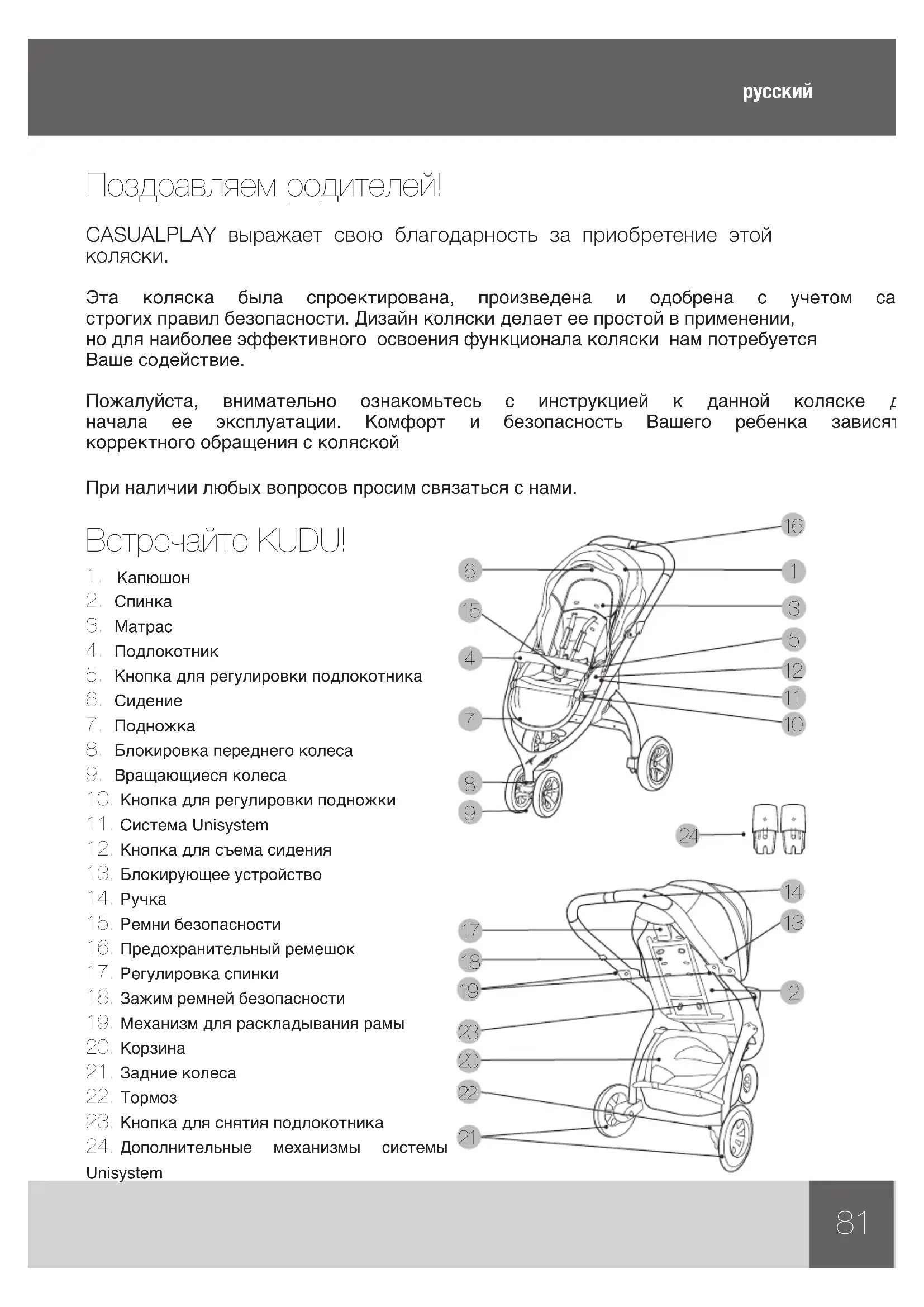 Эта коляска была спроектирована, произведена и одобрена с учетом самых строгихправилбезопасности.Дизайнколяскиделаетеепростойвприменении, нодлянаиболееэффективногоосвоенияфункционалаколяскинампотребуется Вашесодействие. Пожалуйста, внимательно ознакомьтесь с инструкцией к данной коляске до начала ее эксплуатации. Комфорт и безопасность Вашего ребенка зависят от корректногообращениясколяской Приналичиилюбыхвопросовпросимсвязатьсяснами. Встречайте KUDU!82 Предостережения и примечания по безопасности!