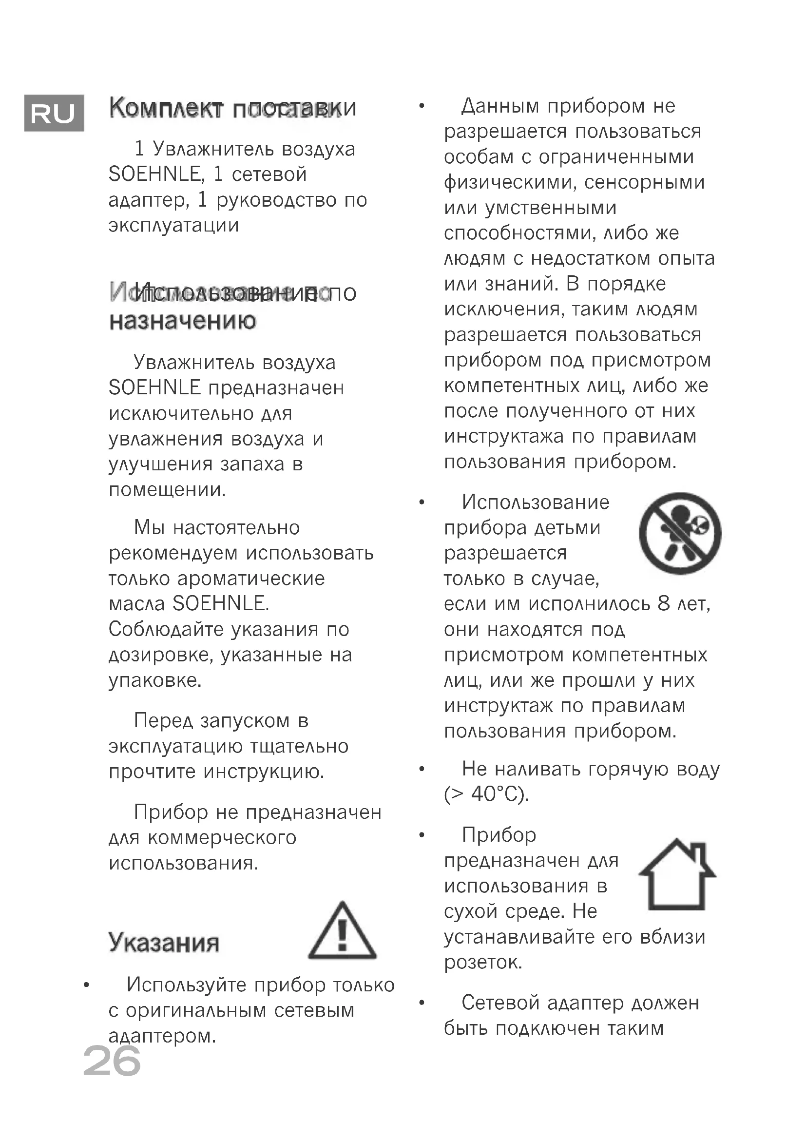 Комплект поставки 1 Увлажнитель воздуха SOEHNLE, 1 сетевой адаптер, 1 руководство по эксплуатации Использование по