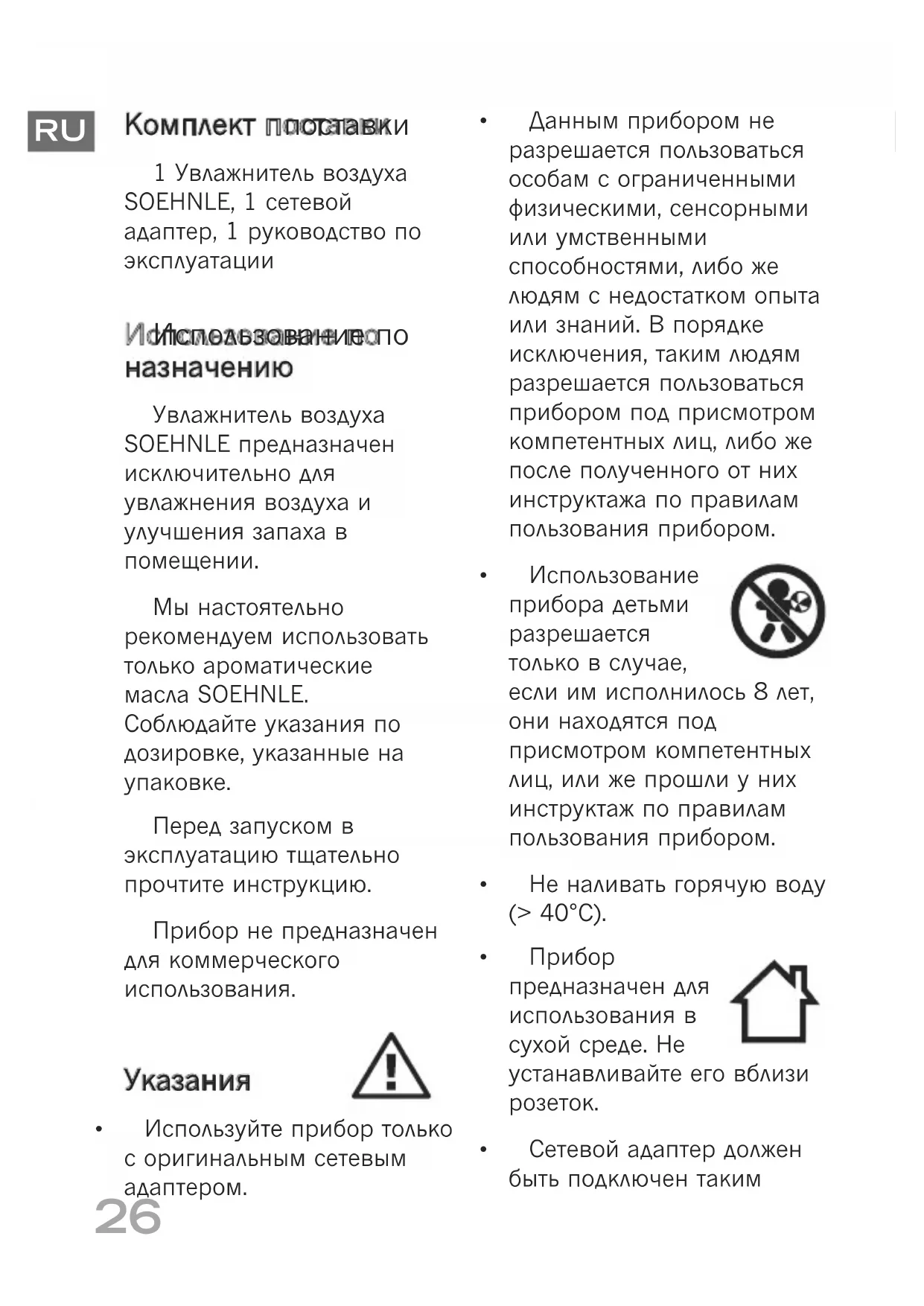 Комплект поставки 1 Увлажнитель воздуха SOEHNLE, 1 сетевой адаптер, 1 руководство по эксплуатации Использование по