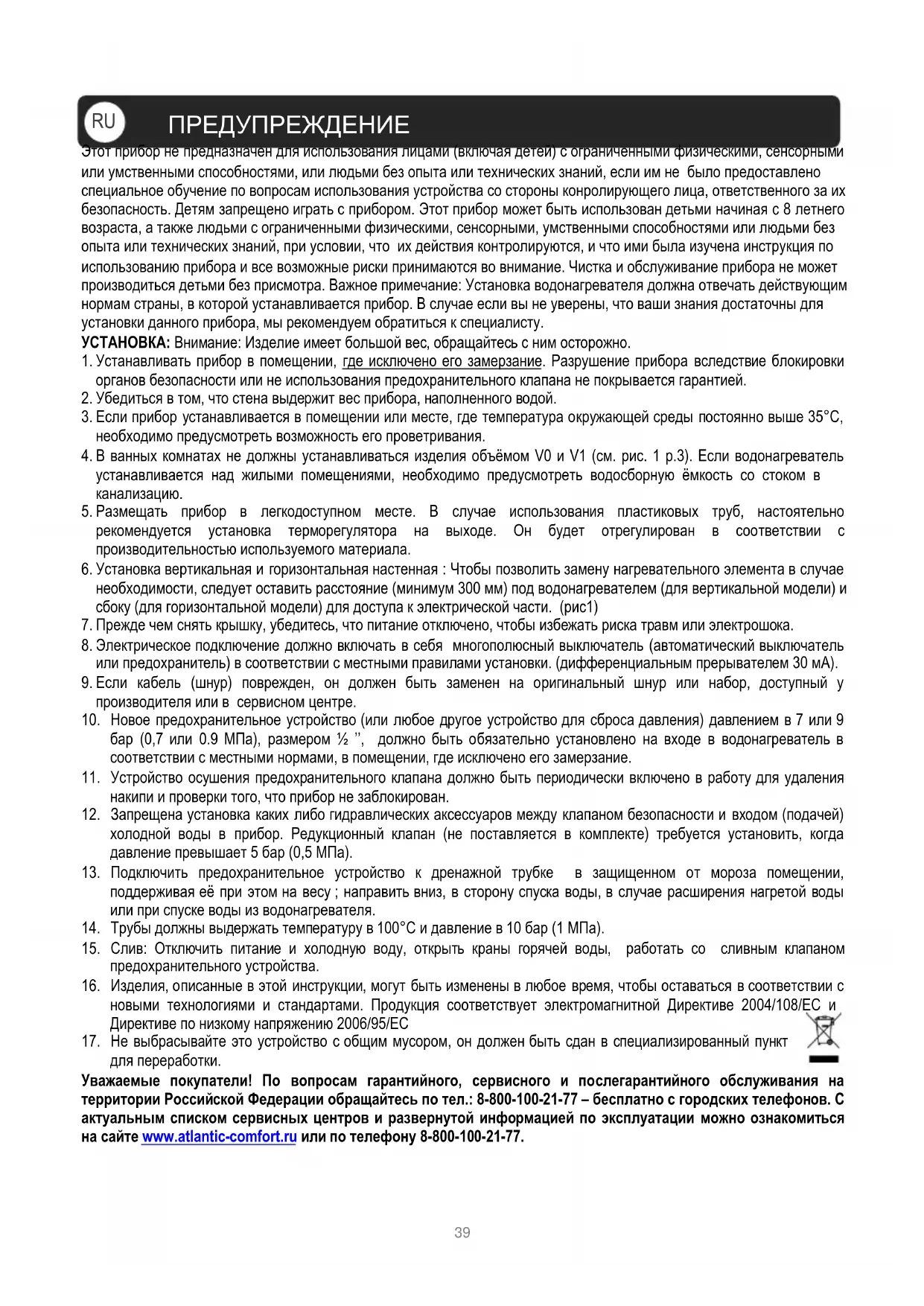 для переработки. Уважаемые покупатели! По вопросам гарантийного, сервисного и послегарантийного обслуживания на территории Российской Федерации обращайтесь по тел.: 8-800-100-21-77 – бесплатно с городских телефонов. С актуальным списком сервисных центров и развернутой информацией по эксплуатации можно ознакомиться на сайте www.atlantic-comfort.ru или по телефону 8-800-100-21-77. RU40