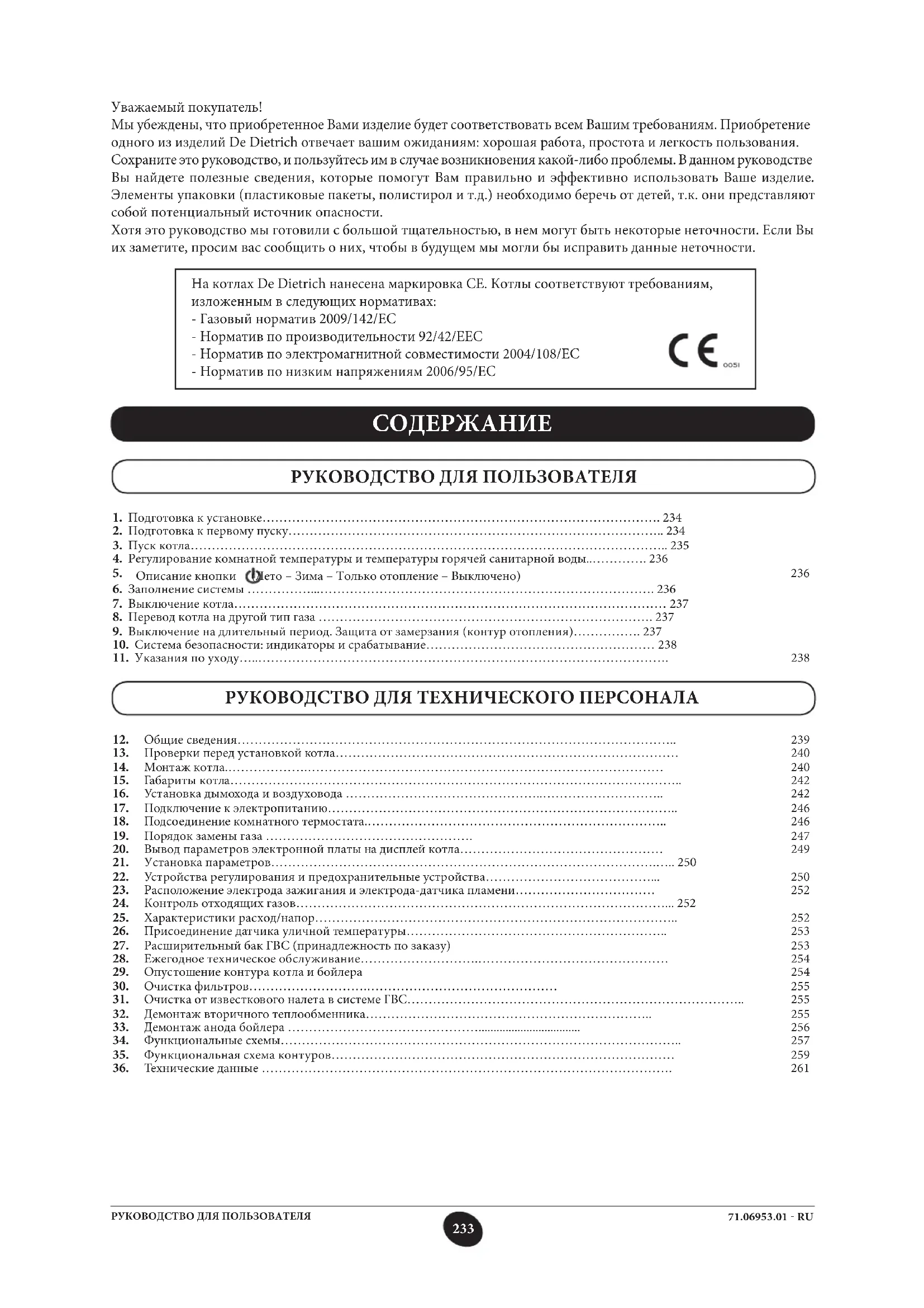 РУКОВОДСТВО ДЛЯ ПОЛЬЗОВАТЕЛЯ РУКОВОДСТВО ДЛЯ ТЕХНИЧЕСКОГО ПЕРСОНАЛА На котлах De Dietrich нанесена маркировка СЕ. Котлы соответствуют требованиям, изложенным в следующих нормативах: - Газовый норматив 2009/142/ЕC - Норматив по производительности 92/42/ЕЕC - Норматив по электромагнитной совместимости 2004/108/ЕC - Норматив по низким напряжениям 2006/95/ЕC234 РУКОВОДСТВО ДЛЯ ПОЛЬЗОВАТЕЛЯ 71.06953.01 - RU Котел предназначен для нагрева воды не выше температуры кипения при атмосферном давлении. Он подключается к системе отопления и к системе приготовления горячей воды в соответствии с его характеристиками и мощностью. Котел должен устанавливаться квалифицированным специалистом. До установки котла необходимо: a) Проверить, что котел настроен на работу с данным типом газа. Данная информация приведена на упаковке и на заводской табличке (шильдике) котла. б) Убедиться, что в дымоходе имеется достаточная тяга, отсутствуют сужения, и нет поступления посторонних продуктов сгорания, за исключением тех случаев, когда дымоход специально спроектирован для обслуживания нескольких устройств. в) При присоединении дымоотводящего патрубка к уже имеющемуся дымоходу проверить, что дымоход полностью очищен, т.к. при работе котла частицы сажи могут оторваться от стенок дымохода и закрыть выход продуктов сгорания, создав тем самым опасную ситуацию. г) Кроме того, чтобы сохранить действие гарантии на оборудование и для поддержания его правильного функционирования, необходимо применять следующие меры предосторожности: