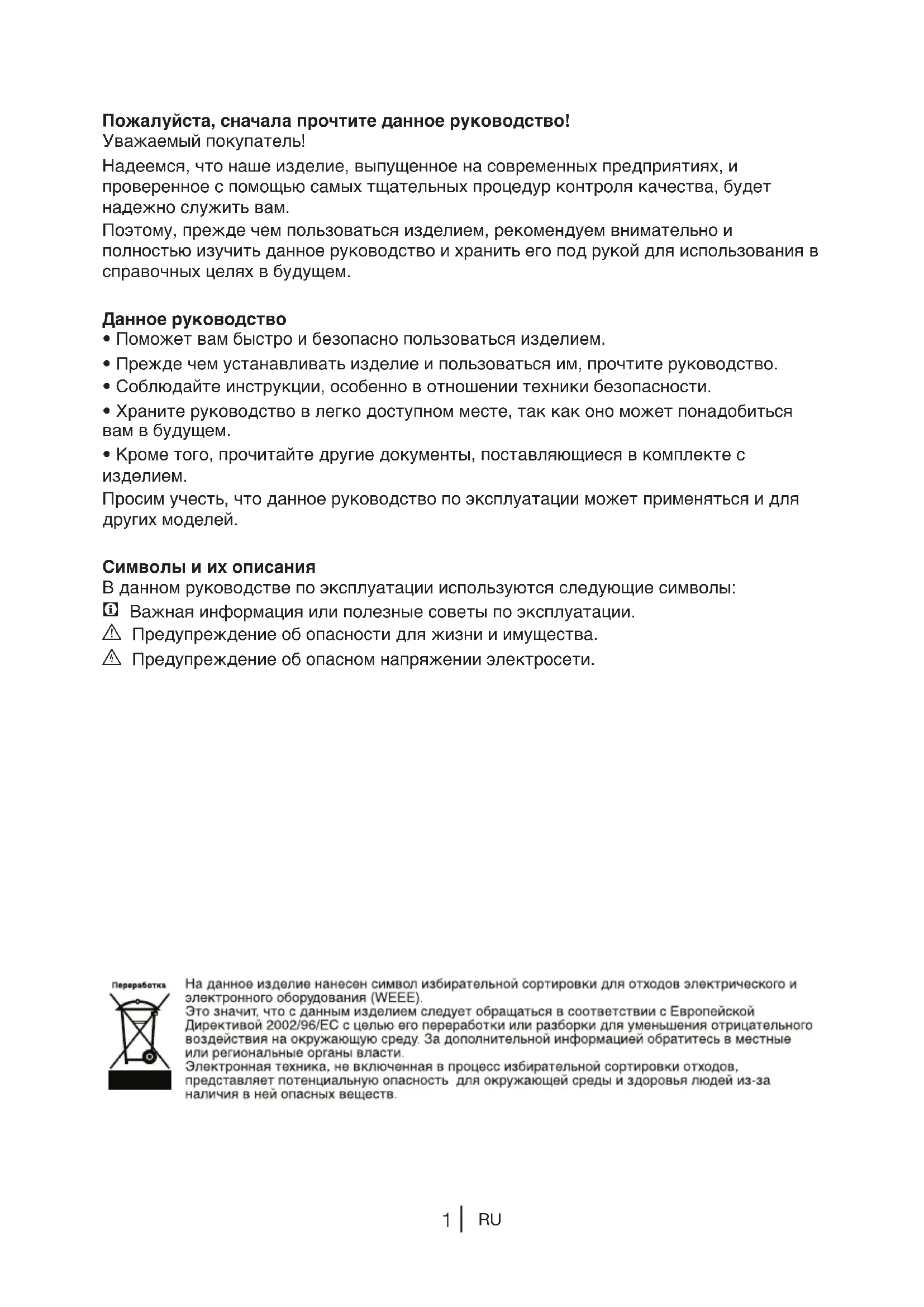 Пожалуйста, сначала прочтите данное руководство! Уважаемый покупатель! Надеемся, что наше изделие, выпущенное на современных предприятиях, и проверенное с помощью самых тщательных процедур контроля качества, будет надежно служить вам. Поэтому, прежде чем пользоваться изделием, рекомендуем внимательно и полностью изучить данное руководство и хранить его под рукой для использования в справочных целях в будущем. Данное руководство