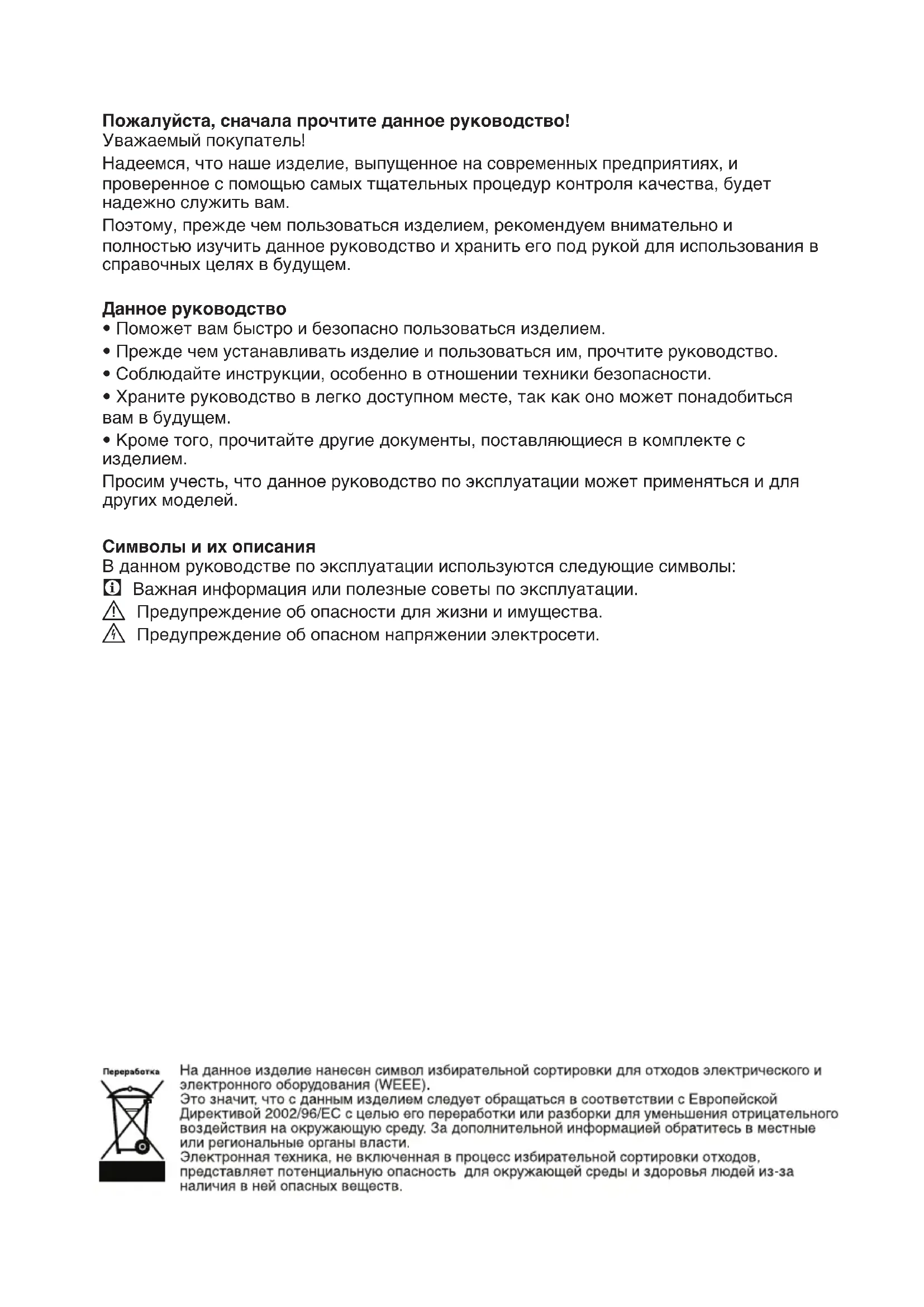 Просим учесть, что данное руководство по эксплуатации может применяться и для других моделей. Символы и их описания В данном руководстве по эксплуатации используются следующие символы: