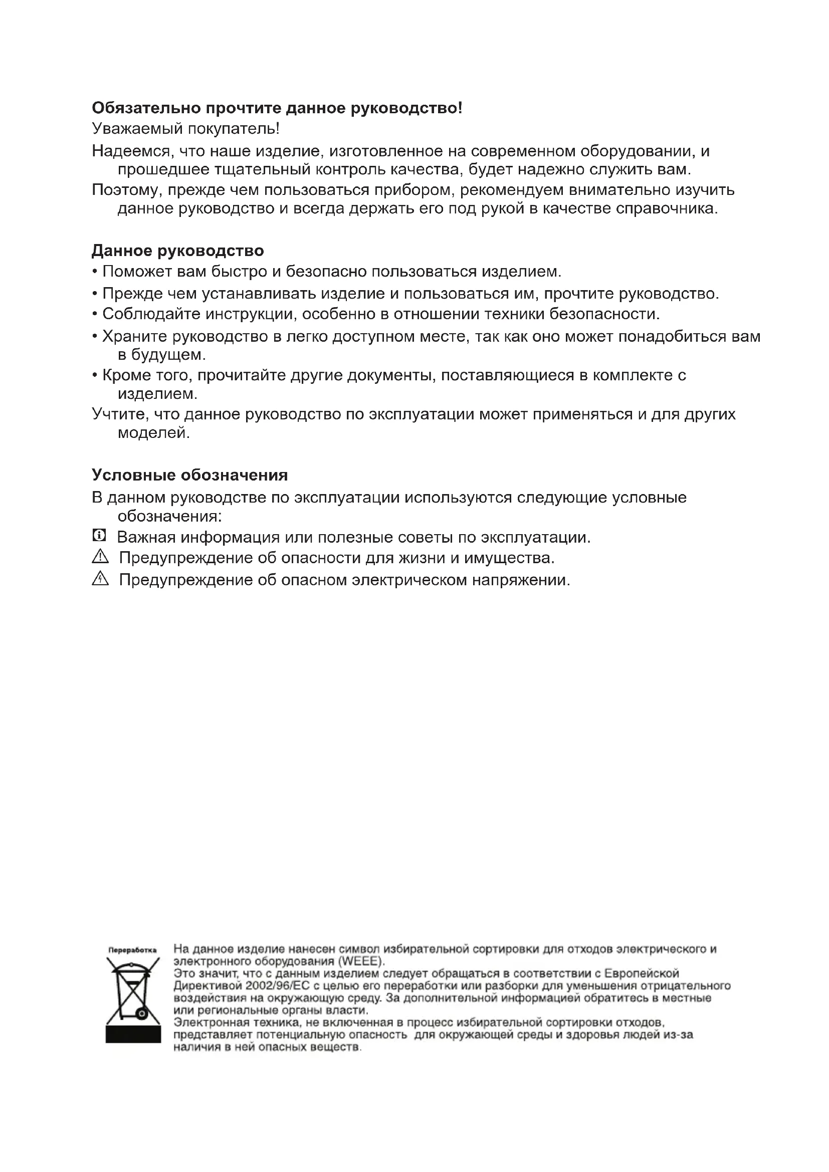 - Обязательно прочтите данное руководство! Уважаемый покупатель! Надеемся, что наше изделие, изготовленное на современном оборудовании, и прошедшее тщательный контроль качества, будет надежно служить вам. Поэтому, прежде чем пользоваться прибором, рекомендуем внимательно изучить данное руководство и всегда держать его под рукой в качестве справочника. Данное руководство