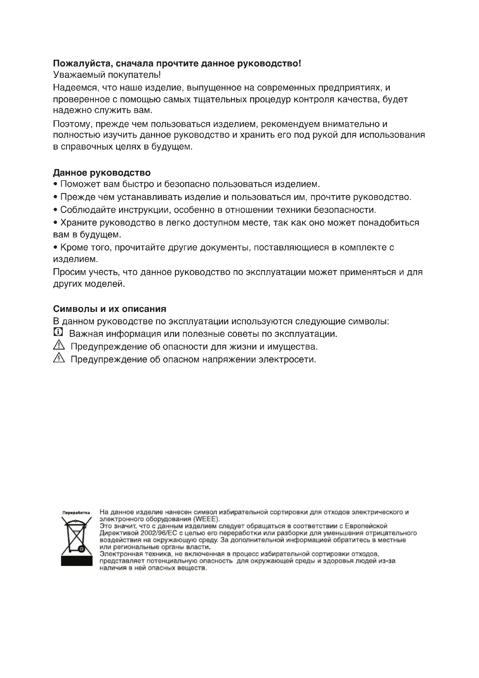 - Прежде чем устанавливать изделие и пользоваться им, прочтите руководство.
