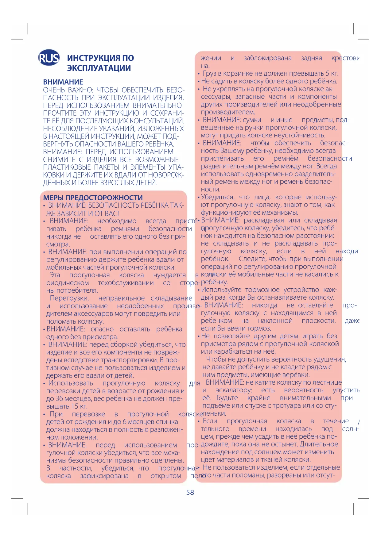 ОЧЕНЬ ВАЖНО: ЧТОБЫ ОБЕСПЕЧИТЬ БЕЗО- ПАСНОСТЬ ПРИ ЭКСПЛУАТАЦИИ ИЗДЕЛИЯ, ПЕРЕД ИСПОЛЬЗОВАНИЕМ ВНИМАТЕЛЬНО ПРОЧТИТЕ ЭТУ ИНСТРУКЦИЮ И СОХРАНИ- ТЕ ЕЁ ДЛЯ ПОСЛЕДУЮЩИХ КОНСУЛЬТАЦИЙ. НЕСОБЛЮДЕНИЕ УКАЗАНИЙ, ИЗЛОЖЕННЫХ В НАСТОЯЩЕЙ ИНСТРУКЦИИ, МОЖЕТ ПОД- ВЕРГНУТЬ ОПАСНОСТИ ВАШЕГО РЕБЁНКА. ВНИМАНИЕ: ПЕРЕД ИСПОЛЬЗОВАНИЕМ СНИМИТЕ С ИЗДЕЛИЯ ВСЕ ВОЗМОЖНЫЕ ПЛАСТИКОВЫЕ ПАКЕТЫ И ЭЛЕМЕНТЫ УПА- КОВКИ И ДЕРЖИТЕ ИХ ВДАЛИ ОТ НОВОРОЖ- ДЁННЫХ И БОЛЕЕ ВЗРОСЛЫХ ДЕТЕЙ. МЕРЫ ПРЕДОСТОРОЖНОСТИ
