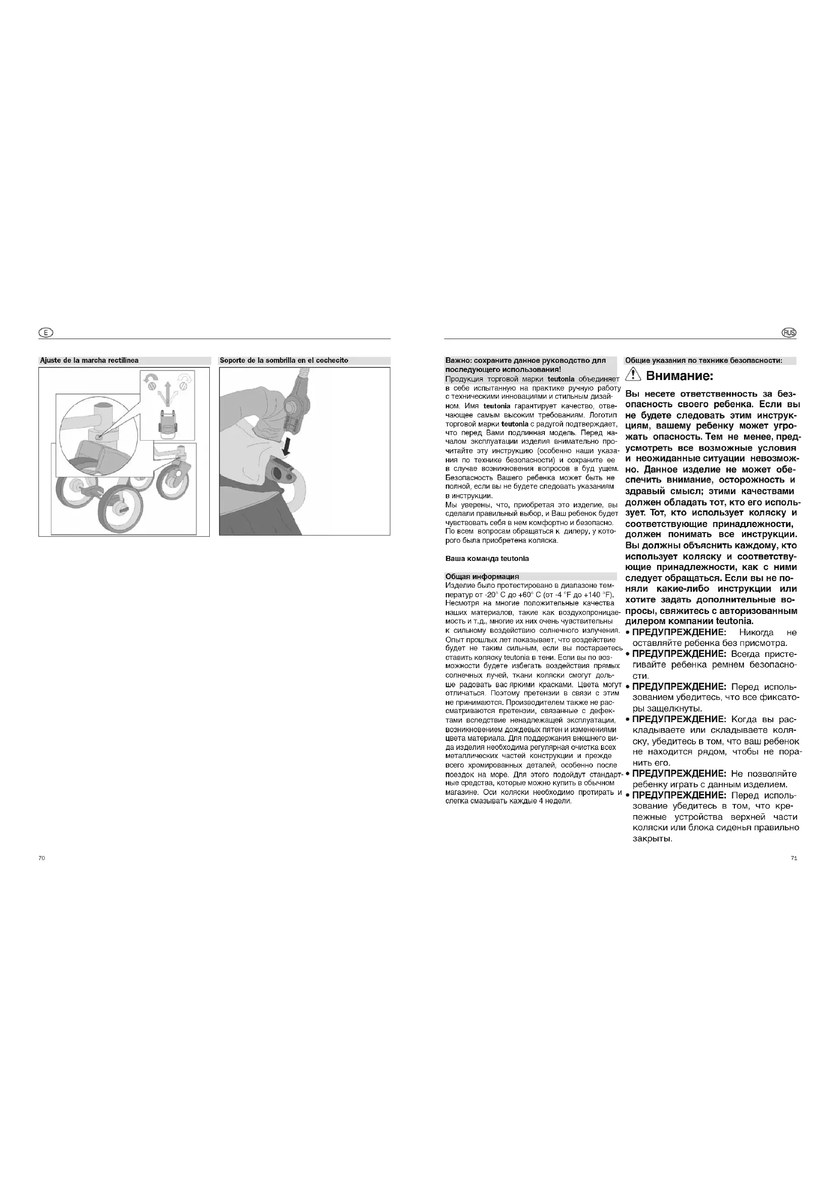 Важно: сохраните данное руководство для последующего использования! Продукция торговой марки teutonia объединяет в себе испытанную на практике ручную работу с техническими инновациями и стильным дизай- ном. Имя teutonia гарантирует качество, отве- чающее самым высоким требованиям. Логотип торговой марки teutonia с радугой подтверждает, что перед Вами подлинная модель. Перед на- чалом эксплуатации изделия внимательно про- читайте эту инструкцию (особенно наши указа- ния по технике безопасности) и сохраните ее в случае возникновения вопросов в буд ущем. Безопасность Вашего ребенка может быть не полной, если вы не будете следовать указаниям в инструкции. Мы уверены, что, приобретая это изделие, вы сделали правильный выбор, и Ваш ребенок будет чувствовать себя в нем комфортно и безопасно. По всем вопросам обращаться к дилеру, у кото- рого была приобретена коляска. Ваша команда teutonia Общая информация Изделие было протестировано в диапазоне тем- ператур от -20° C до +60° C (от -4 °F до +140 °F). Несмотря на многие положительные качества наших материалов, такие как воздухопроницае- мость и т.д., многие их них очень чувствительны к сильному воздействию солнечного излучения. Опыт прошлых лет показывает, что воздействие будет не таким сильным, если вы постараетесь ставить коляску teutonia в тени. Если вы по воз- можности будете избегать воздействия прямых солнечных лучей, ткани коляски смогут доль- ше радовать вас яркими красками. Цвета могут отличаться. Поэтому претензии в связи с этим не принимаются. Производителем также не рас- сматриваются претензии, связанные с дефек- тами вследствие ненадлежащей эксплуатации, возникновением дождевых пятен и изменениями цвета материала. Для поддержания внешнего ви- да изделия необходима регулярная очистка всех металлических частей конструкции и прежде всего хромированных деталей, особенно после поездок на море. Для этого подойдут стандарт- ные средства, которые можно купить в обычном магазине. Оси коляски необходимо протирать и слегка смазывать каждые 4 недели. Общие указания по технике безопасности: