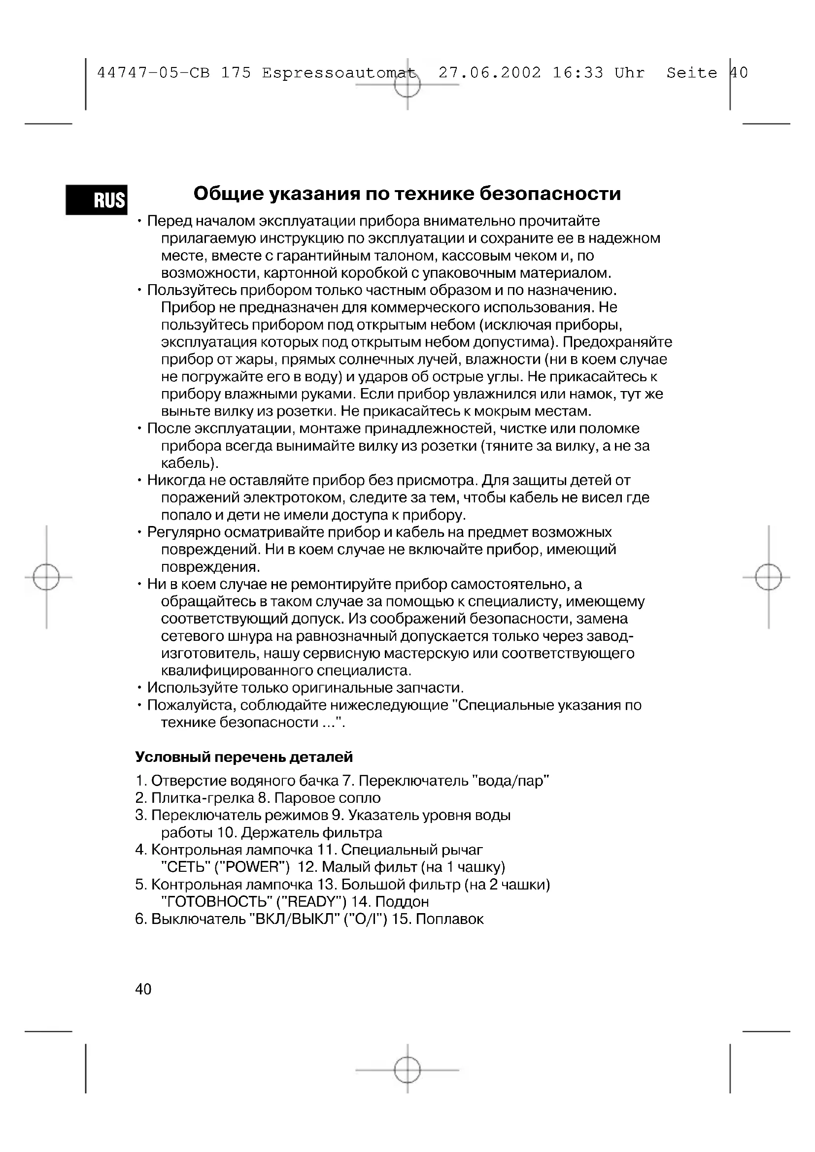 RUS 44747-05-CB 175 Espressoautomat 27.06.2002 16:33 Uhr Seite 40Подготовка к работе Осторожно распакуйте эспрессо-кофеварку. Выньте из коробки все принадлежности и упаковочный материал. Промойте все принадлежности в моющем растворе. Перед тем, как приготовить первую чашку кофе- эспрессо, прогоните кофеварку 2-3 раза для очистки, наполняя ее только холодной водой, как это описано в пунктах 1-8 главы "Приготовление кофе- эспрессо", без добавления молотого кофе-эспрессо. Приготовление кофе-эспрессо