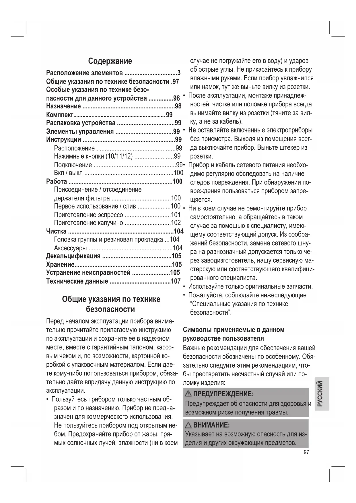 Особые указания по технике безо- пасности для данного устройства ПРЕДУПРЕЖДЕНИЕ: Опасность ожога! Головка группы, держатель фильтра, паровое сопло и поддон для чашек очень сильно на- греваются во время работы устройства.