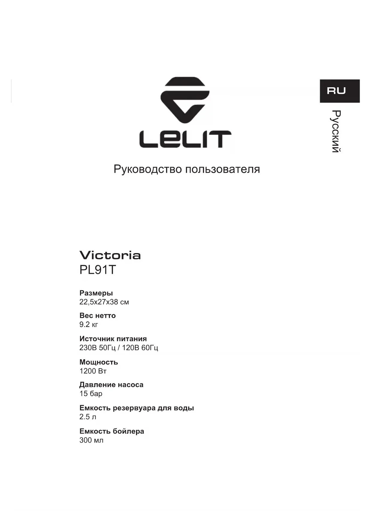 РУКОВОДСТВО ПОЛЬЗОВАТЕЛЯ Victoria PL91T Lelit