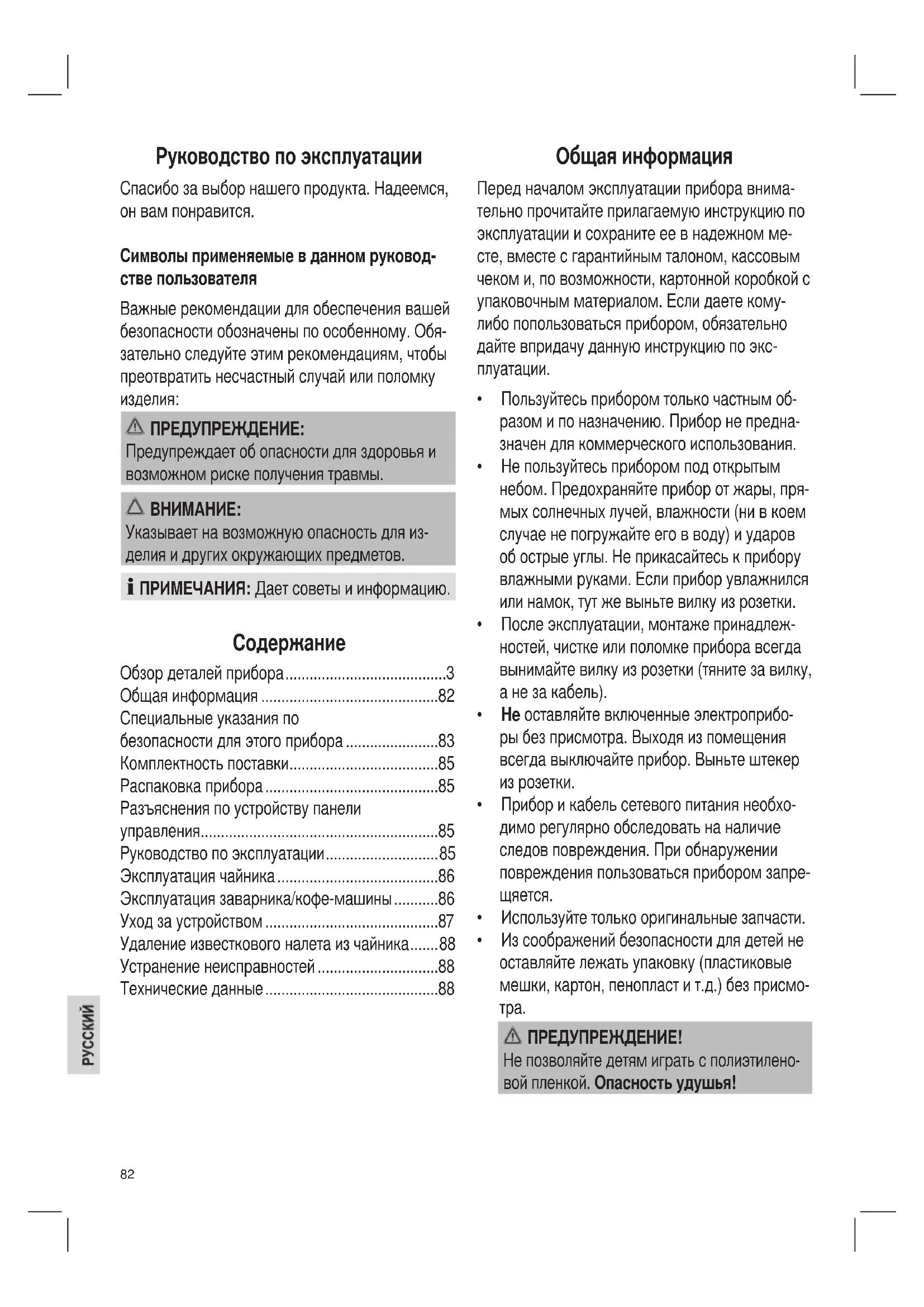 ПРЕДУПРЕЖДЕНИЕ! Непозволяйтедетямигратьсполиэтилено- вой пленкой. Опасность удушья!83 Специальные указания по безопасности для этого прибора Нaиздeлииможнoyвидeтьcлeдyющyюпиктoгpaммycпpeдyпpe- ждeниями или инфopмaциeй: ПРЕДУПРЕЖДЕНИЕ: Горячая поверхность! Риск получения ожогов! Во время и после использования чайника температура доступ- ных поверхностей будет очень высокой.