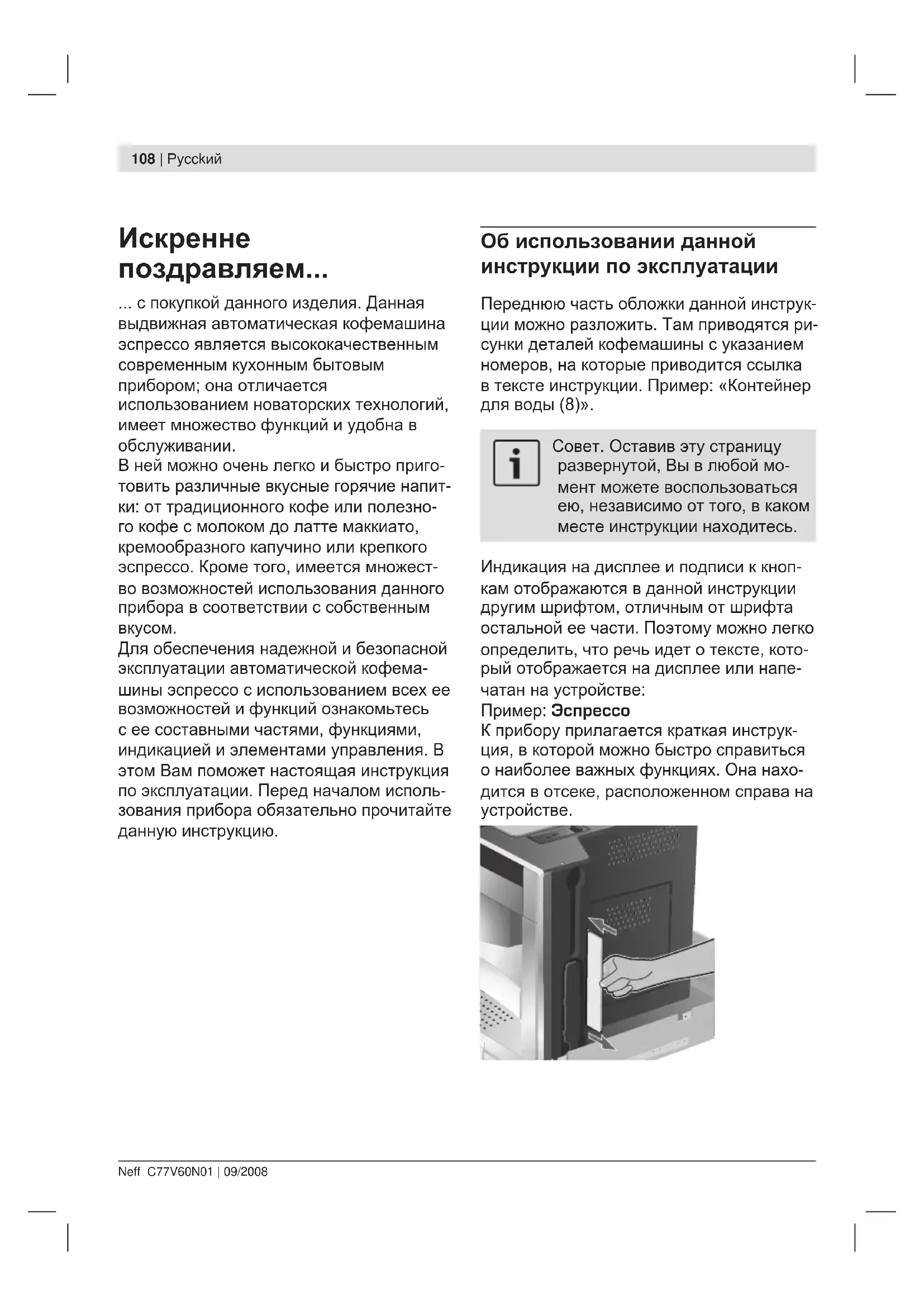 Для обеспечения надежной и безопасной эксплуатации автоматической кофема- шины эспрессо с использованием всех ее возможностей и функций ознакомьтесь с ее составными частями, функциями, индикацией и элементами управления. В этом Вам поможет настоящая инструкция по эксплуатации. Перед началом исполь- зования прибора обязательно прочитайте данную инструкцию. Об использовании данной инструкции по эксплуатации Переднюю часть обложки данной инструк- ции можно разложить. Там приводятся ри- сунки деталей кофемашины с указанием номеров, на которые приводится ссылка в тексте инструкции. Пример: «Контейнер для воды (8)». Совет. Оставив эту страницу развернутой, Вы в любой мо- мент можете воспользоваться ею, независимо от того, в каком месте инструкции находитесь. Индикация на дисплее и подписи к кноп- кам отображаются в данной инструкции другим шрифтом, отличным от шрифта остальной ее части. Поэтому можно легко определить, что речь идет о тексте, кото- рый отображается на дисплее или напе- чатан на устройстве: Пример: Эспрессо К прибору прилагается краткая инструк- ция, в которой можно быстро справиться о наиболее важных функциях. Она нахо- дится в отсеке, расположенном справа на устройстве.Pycckий | 109 Neff C77V60N01 | 09/2008