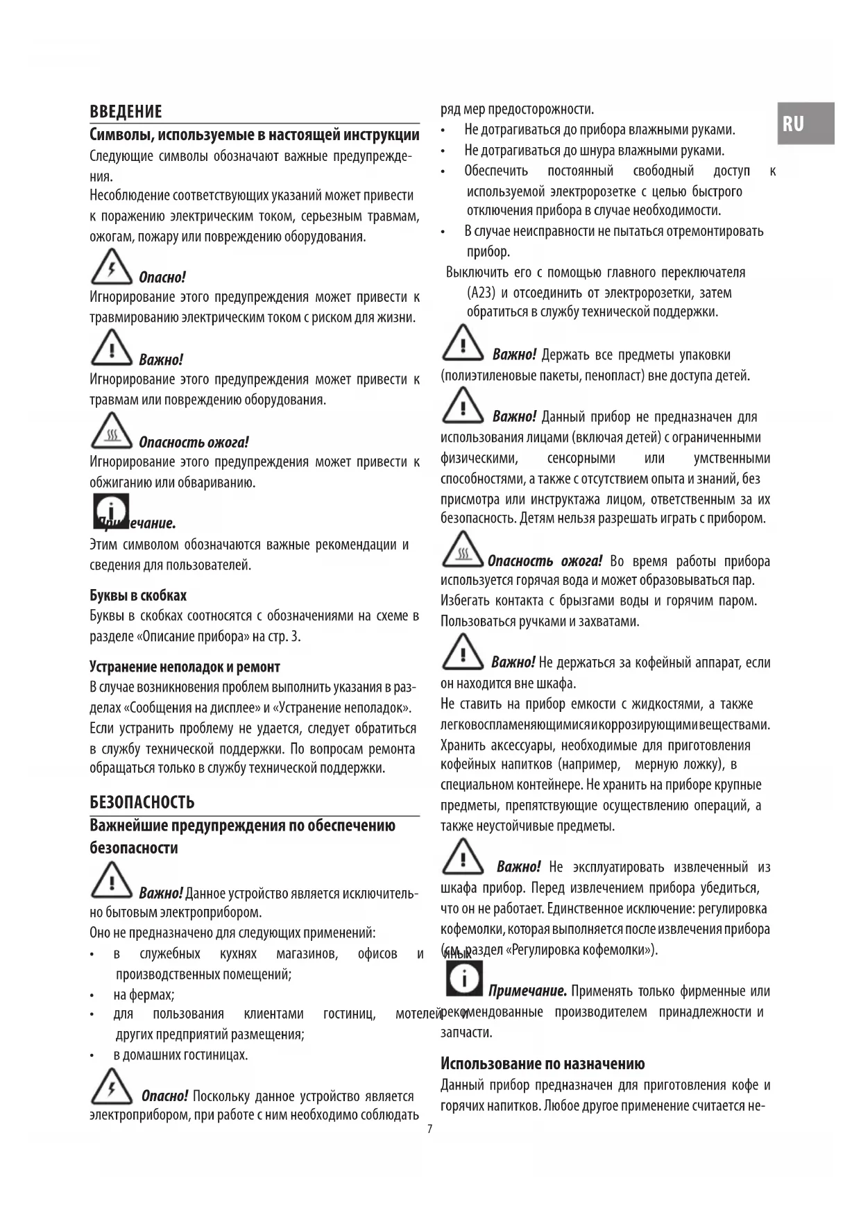 Игнорирование этого предупреждения может привести к травмам или повреждению оборудования. Опасность ожога! Игнорирование этого предупреждения может привести к обжиганию или обвариванию. Примечание. Этим символом обозначаются важные рекомендации и сведения для пользователей. Буквы в скобках Буквы в скобках соотносятся с обозначениями на схеме в разделе «Описание прибора» на стр. 3. Устранение неполадок и ремонт В случае возникновения проблем выполнить указания в раз- делах «Сообщения на дисплее» и «Устранение неполадок». Если устранить проблему не удается, следует обратиться в службу технической поддержки. По вопросам ремонта обращаться только в службу технической поддержки. БЕЗОПАСНОСТЬ Важнейшие предупреждения по обеспечению безопасности Важно! Данное устройство является исключитель- но бытовым электроприбором. Оно не предназначено для следующих применений: