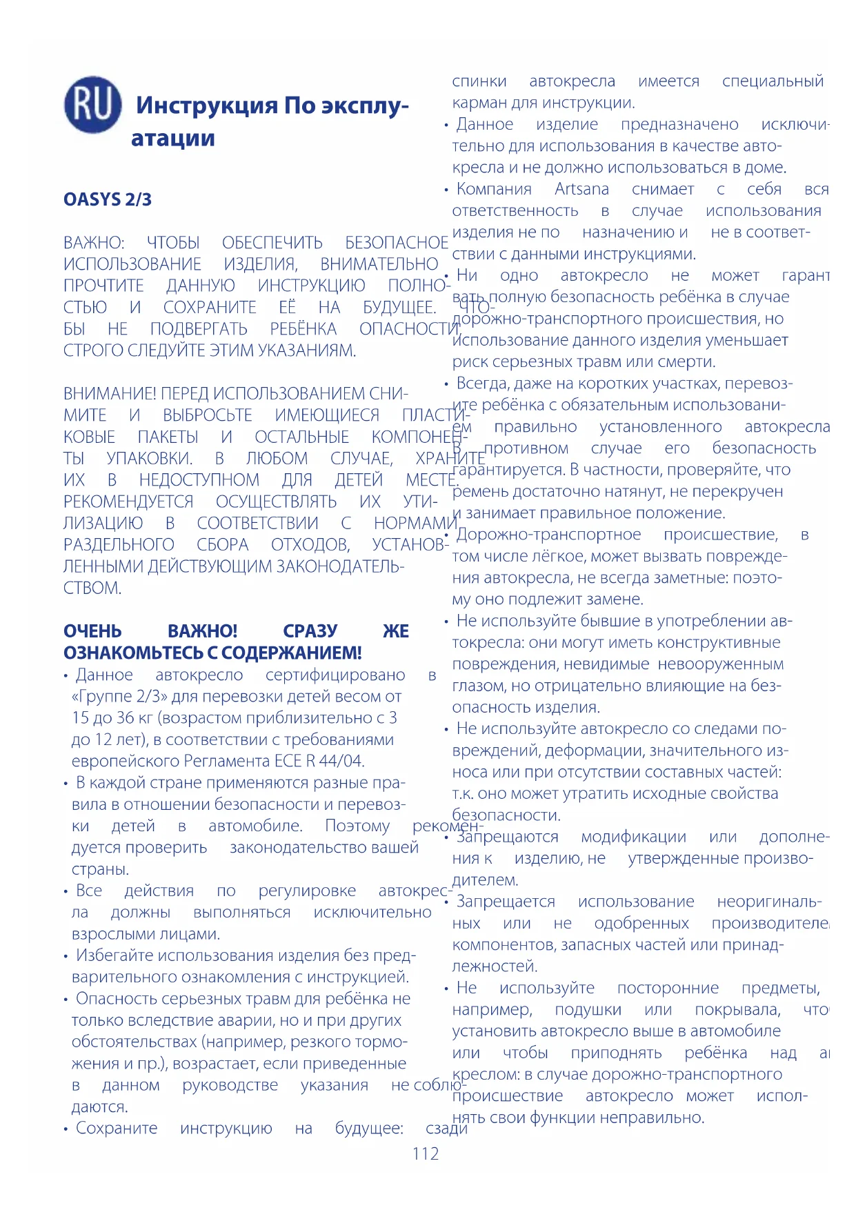 OASYS 2/3 ВАЖНО: ЧТОБЫ ОБЕСПЕЧИТЬ БЕЗОПАСНОЕ ИСПОЛЬЗОВАНИЕ ИЗДЕЛИЯ, ВНИМАТЕЛЬНО ПРОЧТИТЕ ДАННУЮ ИНСТРУКЦИЮ ПОЛНО- СТЬЮ И СОХРАНИТЕ ЕЁ НА БУДУЩЕЕ. ЧТО- БЫ НЕ ПОДВЕРГАТЬ РЕБЁНКА ОПАСНОСТИ, СТРОГОСЛЕДУЙТЕЭТИМУКАЗАНИЯМ. ВНИМАНИЕ!ПЕРЕДИСПОЛЬЗОВАНИЕМСНИ- МИТЕ И ВЫБРОСЬТЕ ИМЕЮЩИЕСЯ ПЛАСТИ- КОВЫЕ ПАКЕТЫ И ОСТАЛЬНЫЕ КОМПОНЕН- ТЫ УПАКОВКИ. В ЛЮБОМ СЛУЧАЕ, ХРАНИТЕ ИХ В НЕДОСТУПНОМ ДЛЯ ДЕТЕЙ МЕСТЕ. РЕКОМЕНДУЕТСЯ ОСУЩЕСТВЛЯТЬ ИХ УТИ- ЛИЗАЦИЮ В СООТВЕТСТВИИ С НОРМАМИ РАЗДЕЛЬНОГО СБОРА ОТХОДОВ, УСТАНОВ- ЛЕННЫМИДЕЙСТВУЮЩИМЗАКОНОДАТЕЛЬ-