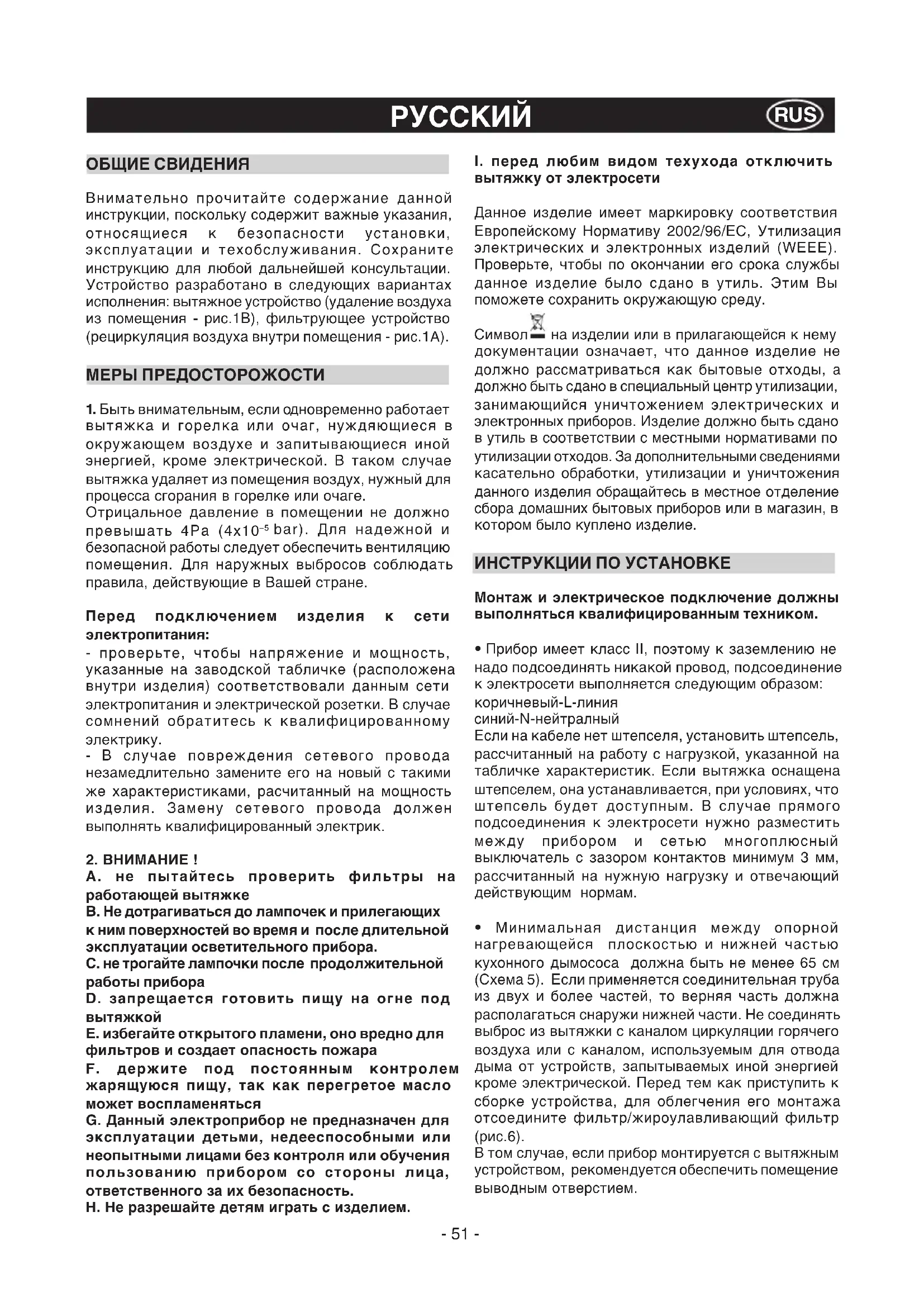 E. избегайте открытого пламени, оно вредно для фильтров и создает опасность пожара F. держите под постоянным контролем жарящуюся пищу, так как перегретое масло может воспламеняться G. Данный электроприбор не предназначен для эксплуатации детьми, недееспособными или неопытными лицами без контроля или обучения пользованию прибором со стороны лица, ответственного за их безопасность. H. Не разрешайте детям играть с изделием.