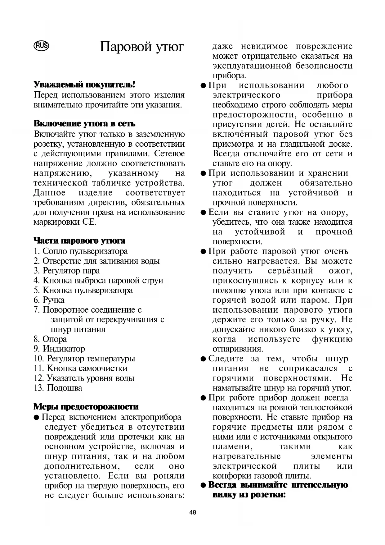 ● При использовании любого электрического прибора необходимо строго соблюдать меры предосторожности, особенно в присутствии детей. Не оставляйте включённый паровой утюг без присмотра и на гладильной доске. Всегда отключайте его от сети и ставьте его на опору. ● При использовании и хранении утюг должен обязательно находиться на устойчивой и прочной поверхности. ● Если вы ставите утюг на опору, убедитесь, что она также находится на устойчивой и прочной поверхности. ● При работе паровой утюг очень сильно нагревается. Вы можете получить серьёзный ожог, прикоснувшись к корпусу или к подошве утюга или при контакте с горячей водой или паром. При использовании парового утюга держите его только за ручку. Не допускайте никого близко к утюгу, когда используете функцию отпаривания. ● Следите за тем, чтобы шнур питания не соприкасался с горячими поверхностями. Не наматывайте шнур на горячий утюг. ● При работе прибор должен всегда находиться на ровной теплостойкой поверхности. Не ставьте прибор на горячие предметы или рядом с ними или с источниками открытого пламени, такими как нагревательные элементы электрической плиты или конфорки газовой плиты.