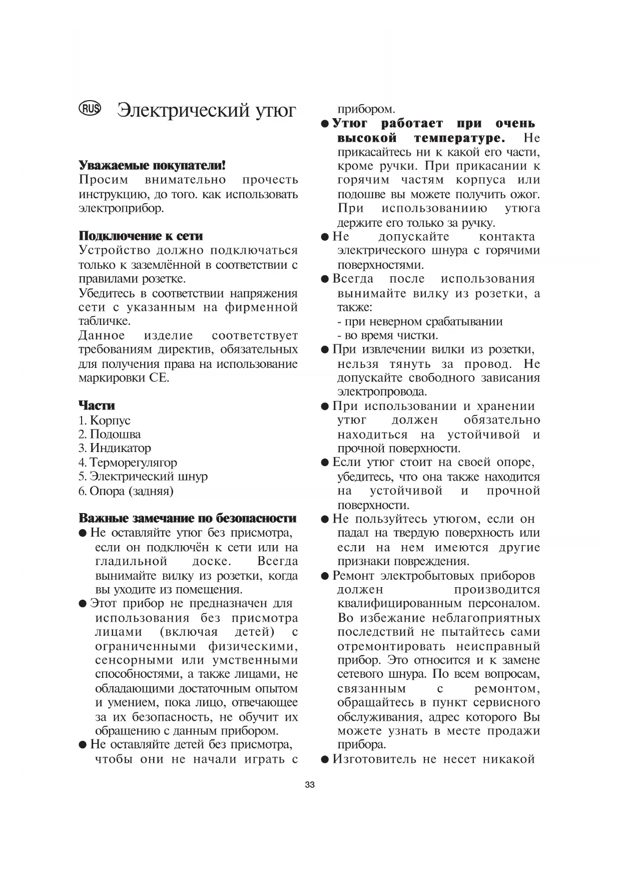 ● Перед чисткой утюга не забудьте отключить его от источника питания и остудите его полностью. ● Если необходимо, можно протереть его сухой безворсовой тканью. ● Во избежание электрического шока не чистите утюг водой и не погружайте его в воду. ● Для защиты чистой нижней плиты, можно периодически нанести немножко керосина на теплую плиту и потом вытереть плиту шерстяной тряпкой. 34● Удалять отложения крахмала, жира и т.д. с нижней плиты можно шерстяной тряпкой, пропитанной раствором уксуса в воде. ● Нельзя использовать абразивные средства или моющие растворы сильного действия. ● Не ставьте утюг его подошвой на шероховатые поверхности.