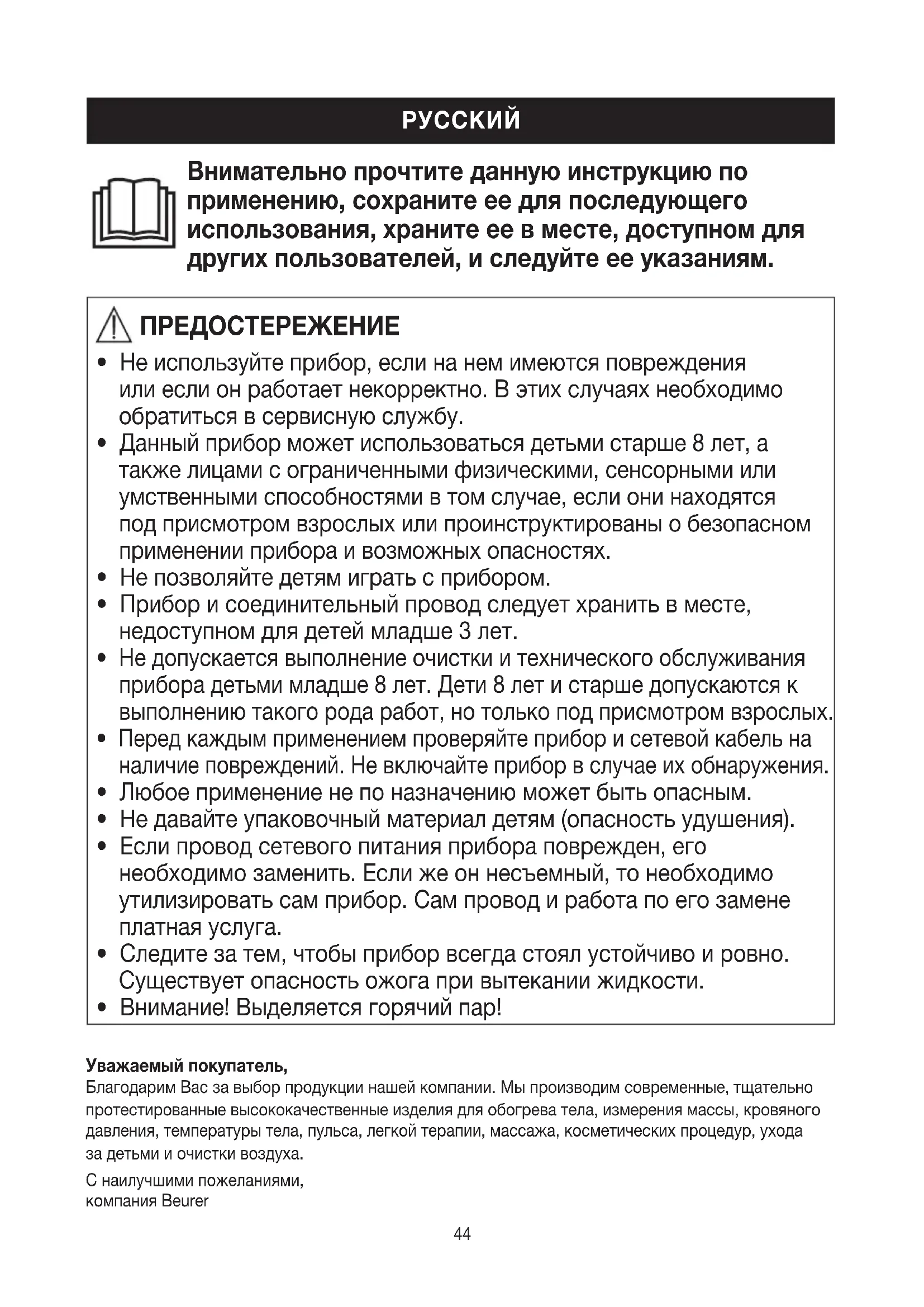 - Внимание! Выделяется горячий пар! Уважаемый покупатель, Благодарим Вас завыбор продукции нашей компании. Мы производим современные, тщательно протестированные высококачественные изделия для обогрева тела, измерения массы, кровяного давления, температуры тела, пульса, легкой терапии, массажа, косметических процедур, ухода задетьми иочистки воздуха. С наилучшими пожеланиями, компания Beurer РУССКИЙ45