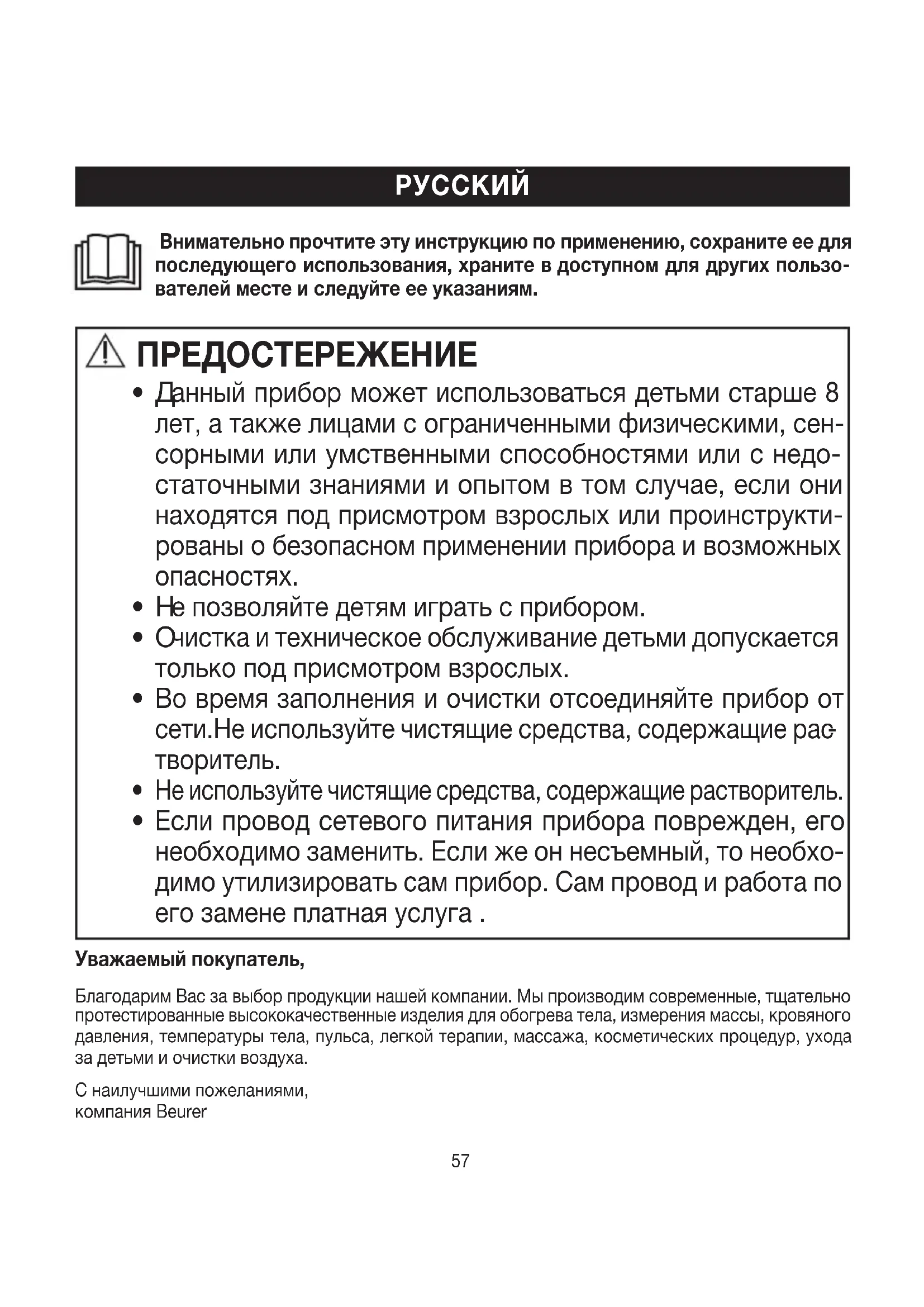 Если провод сетевого питания прибора поврежден, его необходимо заменить. Если же он несъемный, то необхо- димо утилизировать сам прибор. Сам провод и работа по его замене платная услуга . Уважаемый покупатель, Благодарим Вас завыбор продукции нашей компании. Мы производим современные, тщательно протестированные высококачественные изделия для обогрева тела, измерения массы, кровяного давления, температуры тела, пульса, легкой терапии, массажа, косметических процедур, ухода задетьми иочистки воздуха. Снаилучшими пожеланиями, компания Beurer58