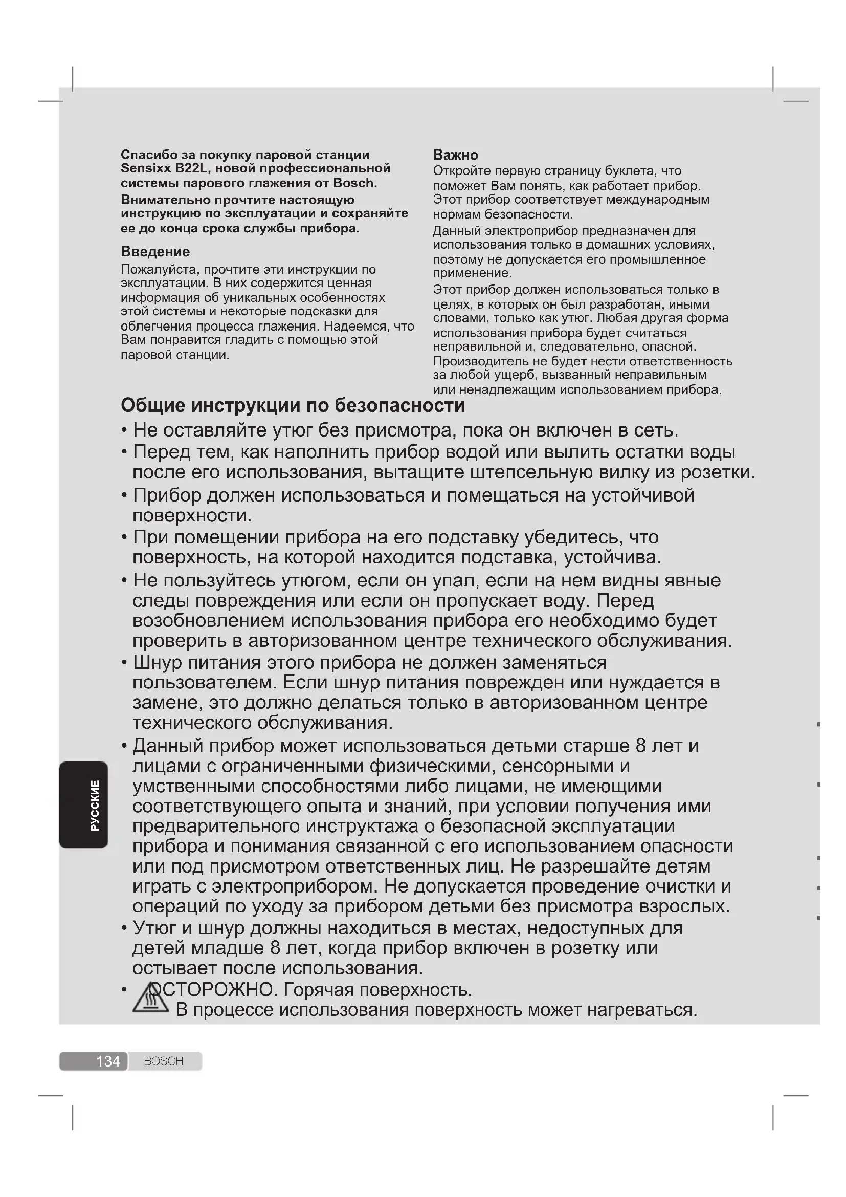Пожалуйста, прочтите эти инструкции по эксплуатации. В них содержится ценная информация об уникальных особенностях этой системы и некоторые подсказки для облегчения процесса глажения. Надеемся, что Вам понравится гладить с помощью этой паровой станции.
