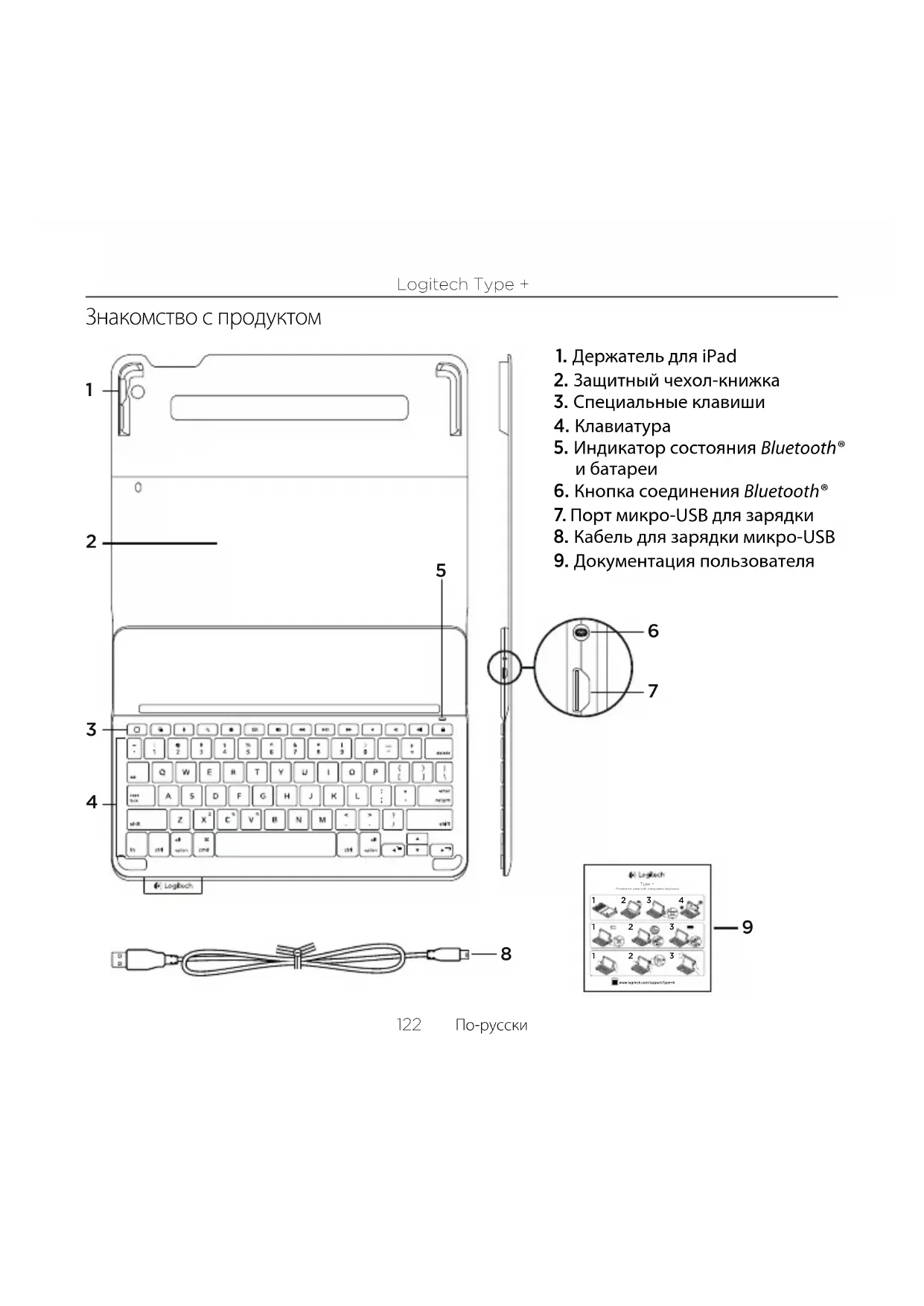 введите его, используя клавиатуру чехла-книжки (не iPad). После установки соединения индикатор состояния на короткое время становится синим, а затем гаснет.Logitech Type + По-русски 125 Использование чехла-книжки склавиатурой Два рабочих положения В чехле-книжке c клавиатурой предусмотрено два рабочих положения — одно для ввода, другое для просмотра. Чтобы перейти в режим ввода, переместите чехол-книжку с клавиатурой в положение для ввода, зафиксировав его с помощью встроенного магнита. При перемещении чехла-книжки в положение для ввода клавиатура включается автоматически. Чтобы перейти в режим просмотра, переместите чехол-книжку с клавиатурой в положение для просмотра: При изменении положения клавиатура автоматически отключается.Logitech Type + 126 По-русски Отсоединение iPad Чтобы отсоединить iPad от чехла- книжки, отогните назад один из угловых держателей iPad. Теперь iPad можно снять. Хранение iPad в поездках