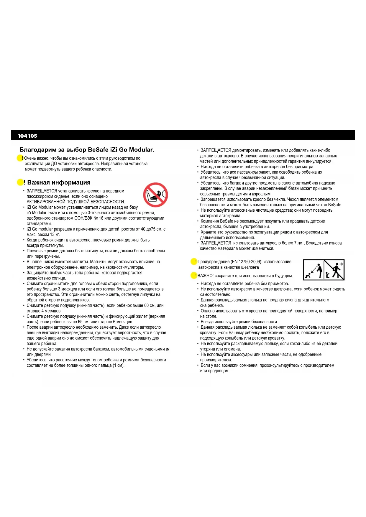 - ЗАПРЕЩАЕТСЯ демонтировать, изменять или добавлять какие-либо детали в автокресло. В случае использования неоригинальных запасных частей или дополнительных принадлежностей гарантия аннулируется.