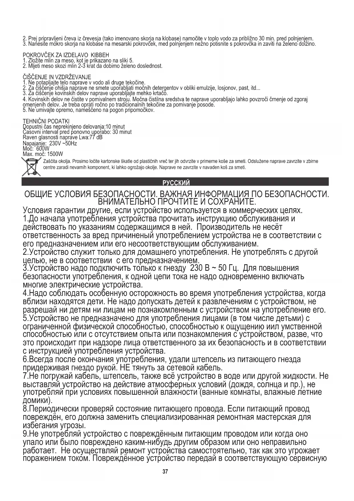 Dopustni čas neprekinjeno delovanja:10 minut Časovni interval pred ponovno uporabo: 30 minut Raven glasnosti naprave Lwa:77 dB Napajanje: 230V ~50Hz Moč: 600W Max. moč: 1500W Zaščita okolja. Prosimo ločite kartonske škatle od plastičnih vreč ter jih odvrzite v primerne koše za smeti. Odslužene naprave zavrzite v zbirne centre zaradi nevarnih komponent, ki lahko ogrožajo okolje. Naprave ne zavrzite v navaden koš za smeti. РУССКИЙточку для проверки или осуществления ремонта. Все ремонты могут осуществлять только сервисные точки, у которых на это право. Неправильно осуществлённый ремонт может спричинить серьёзную угрозу для пользователя. 10.Надо устанавливать устройство на холодной, устойчивой, ровной поверхности, далеко нагревающейся кухонной техники такой как: электрическая плита, газовая горелка и др. 11.Не употреблять устройство вблизи легковоспламеняющихся материалов. 12.Провод питания не может висеть за краем стола или соприкасаться к горячим поверхностям. 13.Не оставляй устройство включеное в гнездо без надзора. 14.Для дополнительной защиты рекомендуется установить в сети устройство защитного отключения (УЗО) с номинальным дифференциальным током не более 30 мА. Для установки, пожалуйста, обратитесь к квалифицированному электрику.