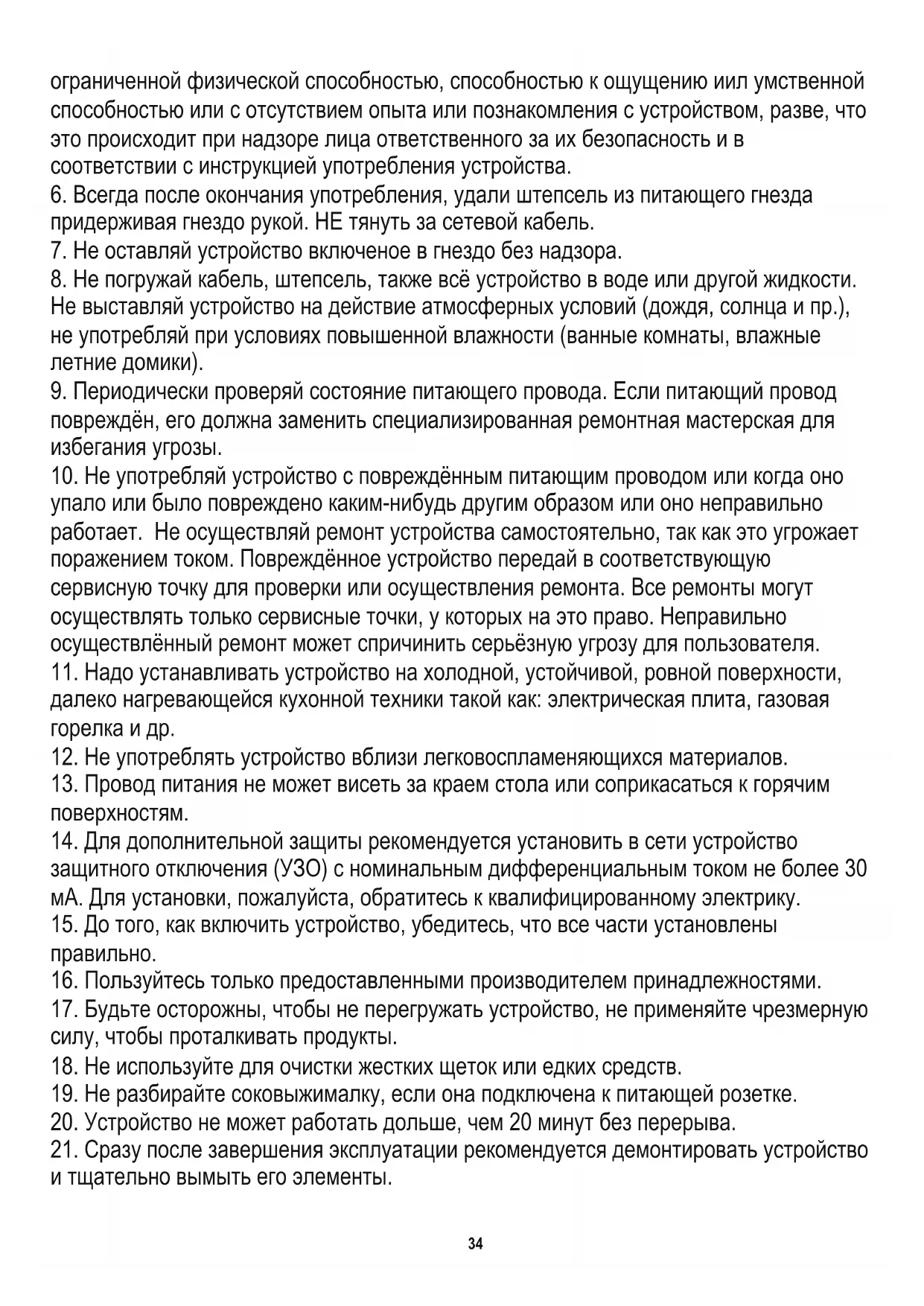 19. Не разбирайте соковыжималку, если она подключена к питающей розетке.