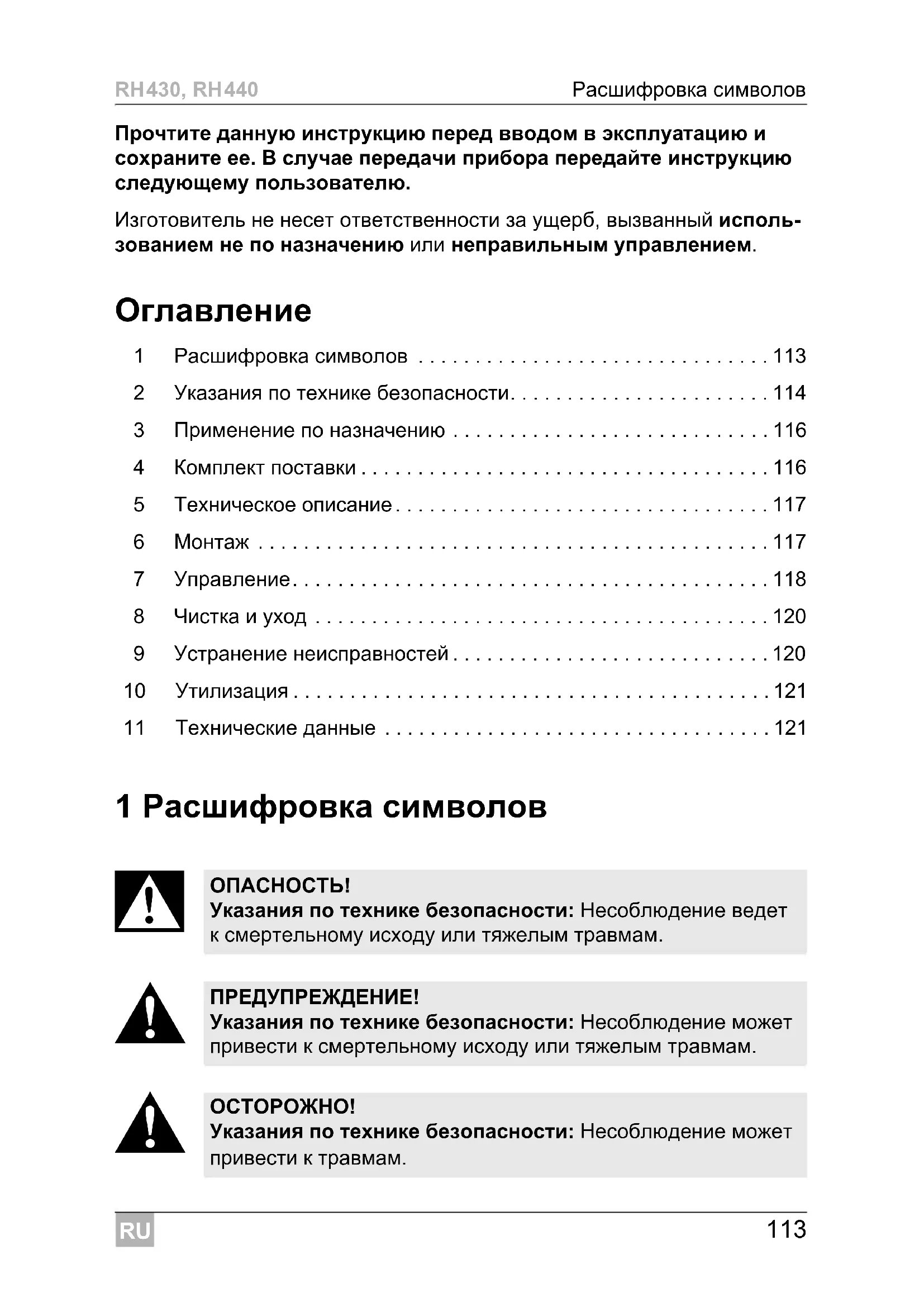 Указания по технике безопасности: Несоблюдение может привести к травмам.RU Указания по технике безопасности RH430, RH440