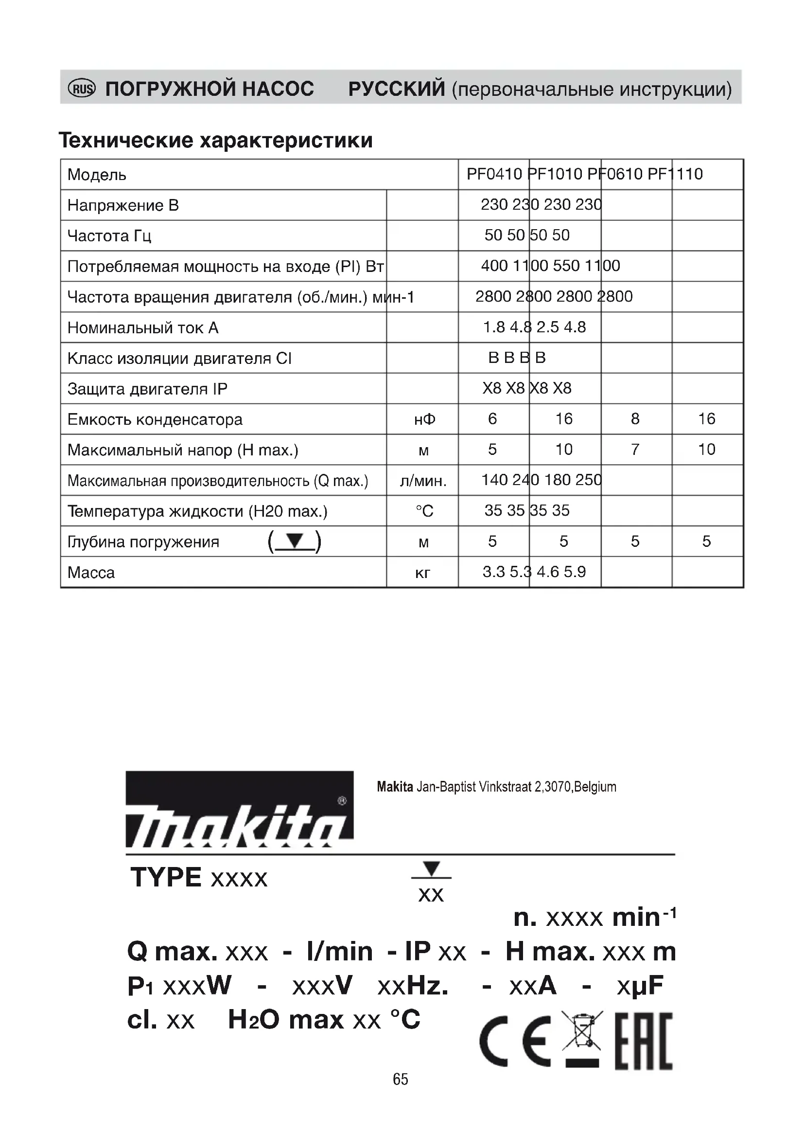 ПОГРУЖНОЙ НАСОС RUS насосы электрические погружные PF0300, PF0800, PF0403, PF1100, PF0410, PF1010, PF0610, PF1110 "Макита" ("MAKITA") соответствуют требованиям технического регламента <<О безопашости машин и оборудвания>> (Постановление правительства РФ от 15.09.2009г .№753) Сертификат соотвествия № C-FI.ME77.B.00313 срок действия до 08.04.2018 г. ,выданный органом по сертификации ООО<<ЭЛМАШ>> аттестат рег. №РОСС RU.0001.11ME77. ООО<<ЭЛМАШ>>: 141400, Московская обл.,г.Химки,ул.Ленинградская, д.29. Тел.(495)781-25-87 Факс.(495) 781-25-88 ОГРН: 110504700422667 РУССКИЙ (первоначальные инструкции)