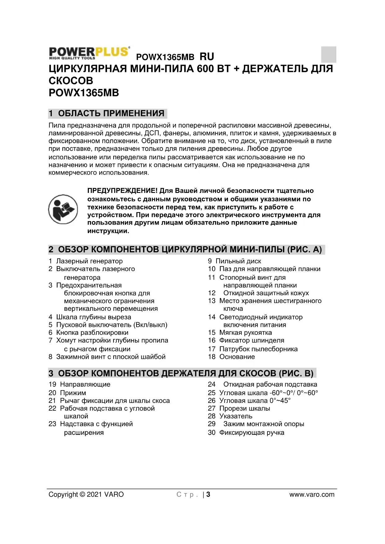 24 Откидная рабочая подставка 25 Угловая шкала -60°~0°/ 0°~60° 26 Угловая шкала 0°~45° 27 Прорези шкалы 28 Указатель 29 Зажим монтажной опоры 30 Фиксирующая ручкаPOWX1365MB RU Copyright © 2021 VARO С т р . | 4 www.varo.com 4 СОДЕРЖИМОЕ УПАКОВКИ Удалите все упаковочные материалы. Удалите остатки упаковки и транспортировочные крепления (если они есть). Проверьте полноту комплекта поставки. Проверьте аппарат, силовой кабель, штепсель и все принадлежности на предмет повреждений при транспортировке. Храните упаковочные материалы, по возможности, до истечения гарантийного срока. После этого избавьтесь от них, используя местную систему утилизации бытовых отходов. ВНИМАНИЕ! Упаковочные материалы - это не игрушки! Не позволяйте детям играть с пластиковыми пакетами! Есть опасность удушения! 1 инструмент 1 руководство по эксплуатации 1 пильный диск с зубьями из закаленной стали (A): для мягкой и твердой древесины, фанеры любого