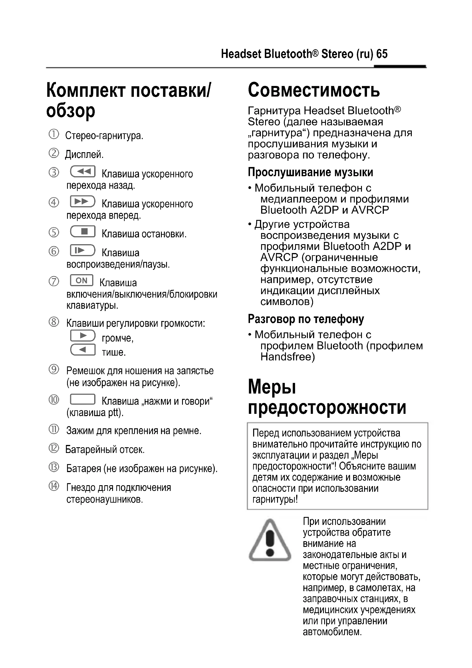 Подготовьте ваш мобильный телефон к воспроизведению музыки. Дополнительная информация приведена в инструкции по эксплуатации мобильного телефона. После подключения гарнитуры к мобильному телефону вы можете прослушивать музыкальные композиции. Для этого используйте боковые клавиши гарнитуры - см. стр.65.