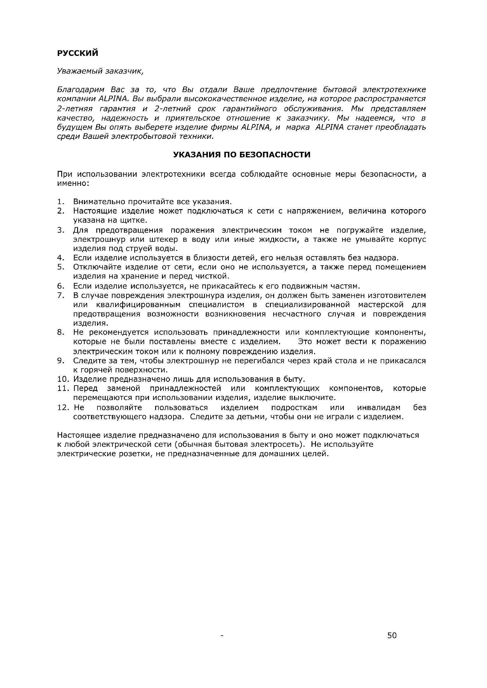 Благодарим Вас за то, что Вы отдали Ваше предпочтение бытовой электротехнике компании ALPINA. Вы выбрали высококачественное изделие, на которое распространяется 2-летняя гарантия и 2-летний срок гарантийного обслуживания. Мы представляем качество, надежность и приятельское отношение к заказчику. Мы надеемся, что в будущем Вы опять выберете изделие фирмы ALPINA, и марка ALPINA станет преобладать среди Вашей электробытовой техники.