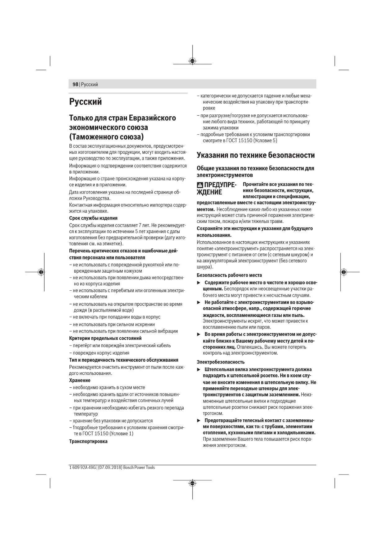 Указанные в настоящих инструкциях уровень вибрации и значение шумовой эмиссии измерены по методике изме- рения, прописанной в стандарте EN62841, и могут быть использованы для сравнения электроинструментов. Они также пригодны для предварительной оценки уровня вибрации и шумовой эмиссии. Уровень вибрации и значение шумовой эмиссии указаны для основных видов работы с электроинструментом. Од- нако если электроинструмент будет использован для вы- полнения других работ с применением непредусмотрен- ных изготовителем рабочих инструментов или техниче- ское обслуживание не будет отвечать предписаниям, то значения уровня вибрации и шумовой эмиссии могут быть иными. Это может значительно повысить общий уровень вибрации и общую шумовую эмиссию в течение всей продолжительности работы. Для точной оценки уровня вибрации и шумовой эмиссии в течение определенного временного интервала нужно учитывать также и время, когда инструмент выключен или, хотя и включен, но не находится в работе. Это может значительно сократить уровень вибрации и шумовую эмиссию в пересчете на полное рабочее время. Предусмотрите дополнительные меры безопасности для защиты оператора от воздействия вибрации, например: техническое обслуживание электроинструмента и рабо- чих инструментов, меры по поддержанию рук в тепле, организация технологических процессов. Русский | 101 Bosch Power Tools 1 609 92A 49G | (07.09.2018)102 | Русский 1 609 92A 49G | (07.09.2018) Bosch Power Tools
