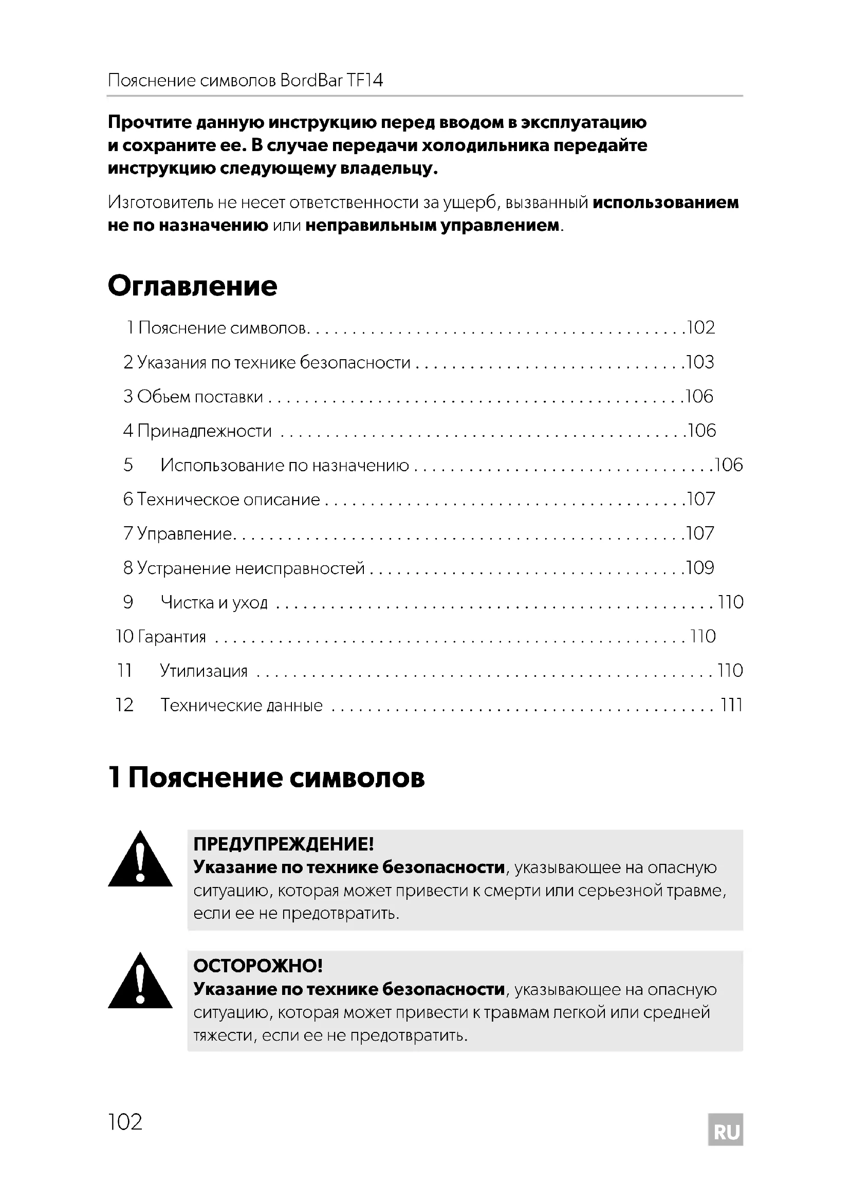 Указание по технике безопасности, указывающее на опасную ситуацию, которая может привести к травмам легкой или средней тяжести, если ее не предотвратить. TF14_OPM_EMEA16.book Seite 102 Donnerstag, 27. Juni 2019 4:38 16RU BordBar TF14 Указания по технике безопасности