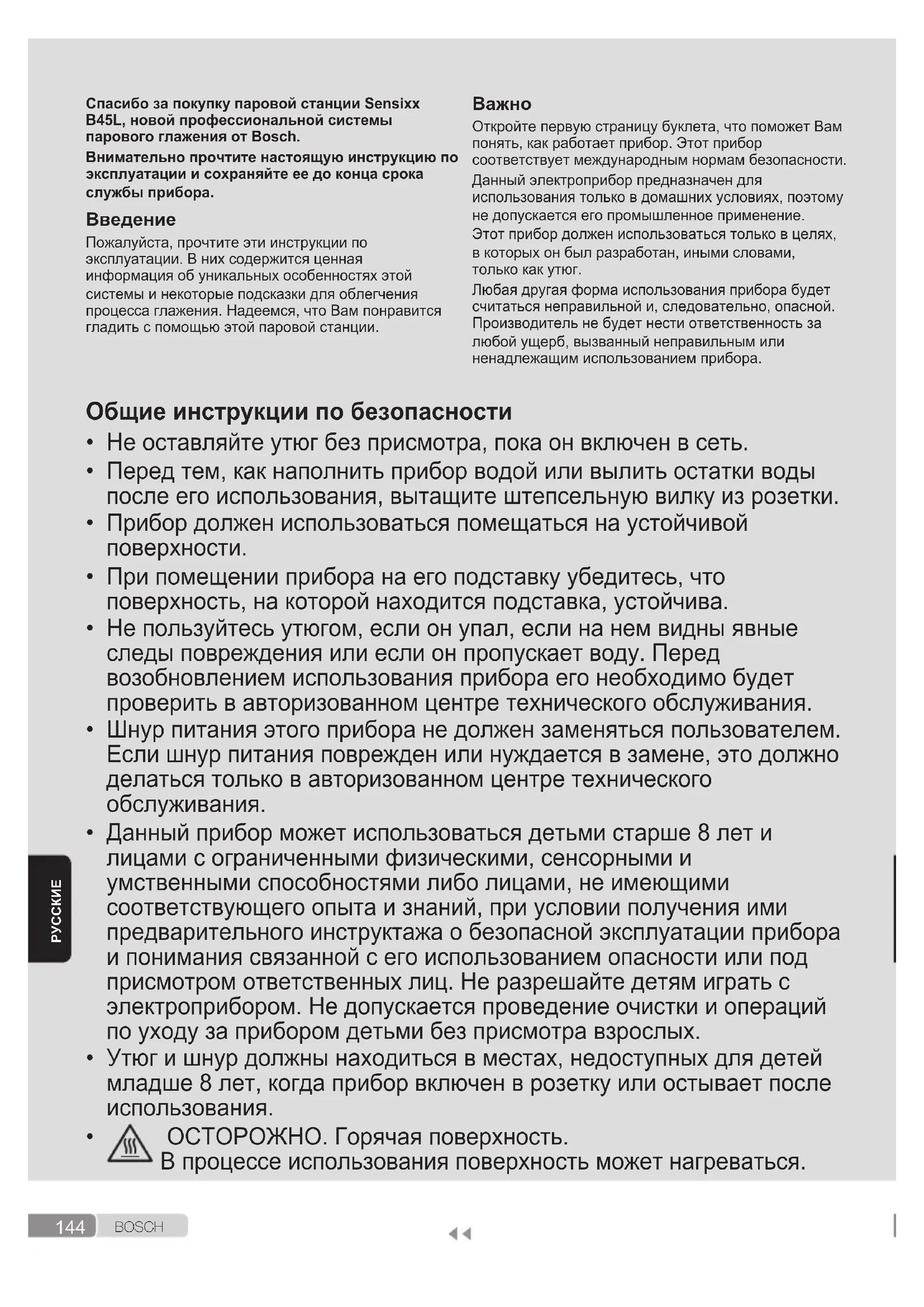 Даний посібник можна завантажити з україської веб-сторінки Bosch.144 B O S C H Спасибо за покупку паровой станции Sensixx B45l, новой профессиональной системы парового глажения от Bosch. Внимательно прочтите настоящую инструкцию по эксплуатации и сохраняйте ее до конца срока службы прибора.