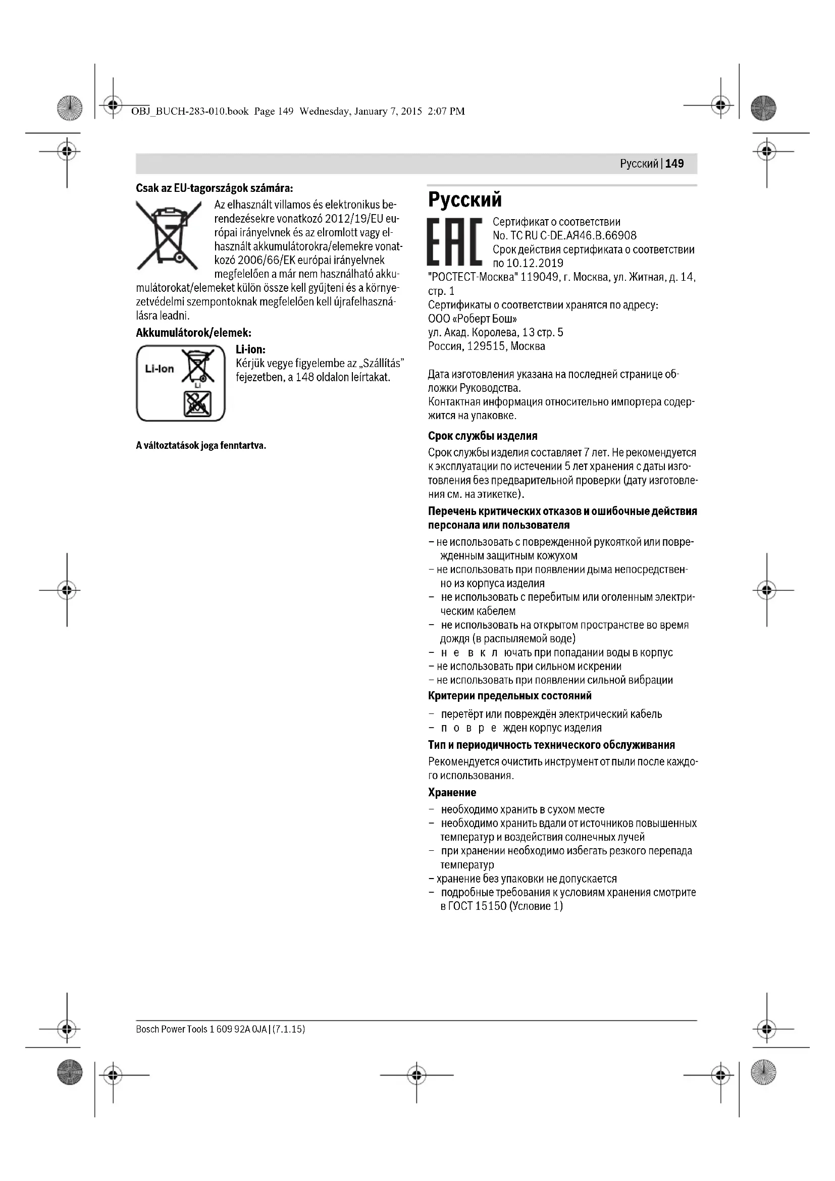 Сертификат о соответствии No. ТС RU С-DE.АЯ46.В.66908 Срок действия сертификата о соответствии по 10.12.2019 "РОСТЕСТ-Москва" 119049, г. Москва, ул. Житная, д. 14, стр. 1 Сертификаты о соответствии хранятся по адресу: ООО «Роберт Бош» ул. Акад. Королева, 13 стр. 5 Россия, 129515, Москва Дата изготовления указана на последней странице об- ложки Руководства. Контактная информация относительно импортера содер- жится на упаковке. Срок службы изделия Срок службы изделия составляет 7 лет. Не рекомендуется к эксплуатации по истечении 5 лет хранения с даты изго- товления без предварительной проверки (дату изготовле- ния см. на этикетке). Перечень критических отказов и ошибочные действия персонала или пользователя – не использовать с поврежденной рукояткой или повре- жденным защитным кожухом – не использовать при появлении дыма непосредствен- но из корпуса изделия –не использовать с перебитым или оголенным электри- ческим кабелем – не использовать на открытом пространстве во время дождя (в распыляемой воде) –не включать при попадании воды в корпус – не использовать при сильном искрении – не использовать при появлении сильной вибрации Критерии предельных состояний – перетёрт или повреждён электрический кабель –поврежден корпус изделия Тип и периодичность технического обслуживания Рекомендуется очистить инструмент от пыли после каждо- го использования.