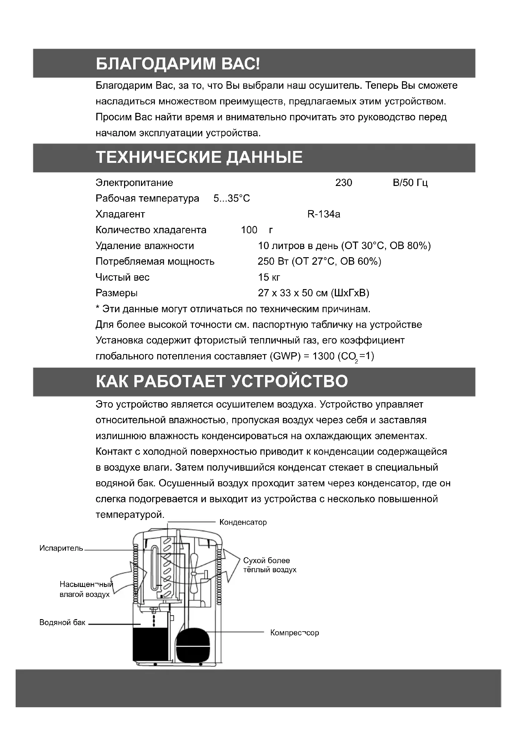 - Podeaua pe care stă aparatul are denivelări? Nu încercaţi de unul singur s ă reparaţi sau să demontaţi aparatul.БЛАГОДАРИМ ВАС! Благодарим Вас, за то, что Вы выбрали наш осушитель. Теперь Вы сможете насладиться множеством преимуществ, предлагаемых этим устройством. Просим Вас найти время и внимательно прочитать это руководство перед началом эксплуатации устройства. ТЕХНИЧЕСКИЕ ДАННЫЕ ɍɫɬɚɧɨɜɤɚ ɫɨɞɟɪɠɢɬ ɮɬɨɪɢɫɬɵɣ ɬɟɩɥɢɱɧɵɣ ɝɚɡ, ɟɝɨ ɤɨɷɮɮɢɰɢɟɧɬ ɝɥɨɛɚɥɶɧɨɝɨ ɩɨɬɟɩɥɟɧɢɹ ɫɨɫɬɚɜɥɹɟɬ (GWP) = 1300 (CO =1) Конденсатор
