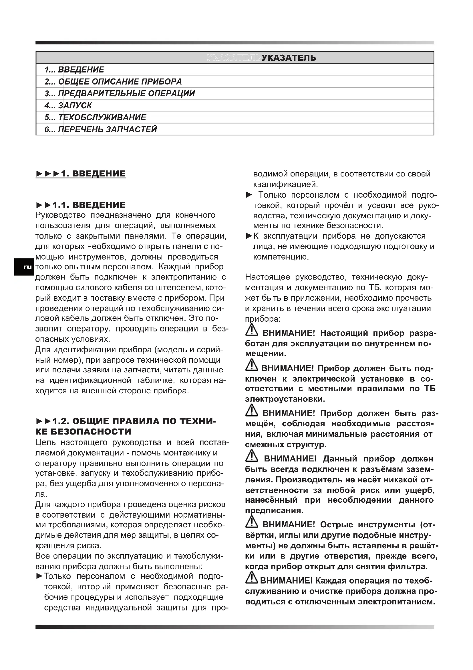 УКАЗАТЕЛЬУКАЗАТЕЛЬ 1... ВВЕДЕНИЕ 2... ОБЩЕЕ ОПИСАНИЕ ПРИБОРА 3... ПРЕДВАРИТЕЛЬНЫЕ ОПЕРАЦИИ 4... ЗАПУСК 5... ТЕХОБСЛУЖИВАНИЕ 6... ПЕРЕЧЕНЬ ЗАПЧАСТЕЙ ►►►1. ВВЕДЕНИЕ ►►1.1. ВВЕДЕНИЕ Руководство предназначено для конечного пользователя для операций, выполняемых только с закрытыми панелями. Те операции, для которых необходимо открыть панели с по- мощью инструментов, должны проводиться только опытным персоналом. Каждый прибор должен быть подключен к электропитанию с помощью силового кабеля со штепселем, кото- рый входит в поставку вместе с прибором. При проведении операций по техобслуживанию си- ловой кабель должен быть отключен. Это по- зволит оператору, проводить операции в без- опасных условиях. Для идентификации прибора (модель и серий- ный номер), при запросе технической помощи или подачи заявки на запчасти, читать данные на идентификационной табличке, которая на- ходится на внешней стороне прибора. ►►1.2. ОБЩИЕ ПРАВИЛА ПО ТЕХНИ- КЕ БЕЗОПАСНОСТИ Цель настоящего руководства и всей постав- ляемой документации - помочь монтажнику и оператору правильно выполнить операции по установке, запуску и техобслуживанию прибо- ра, без ущерба для уполномоченного персона-