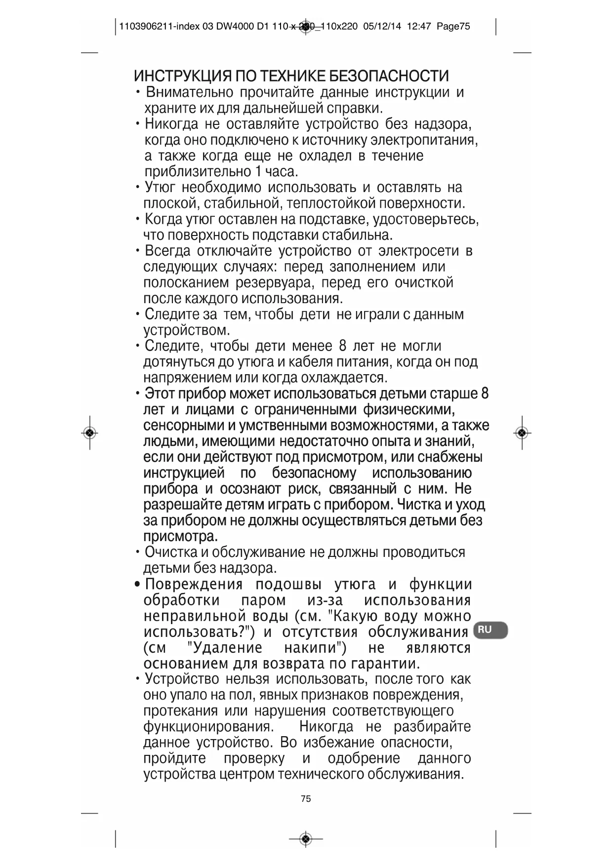 - В зависимости от модели 1103906211-index 03 DW4000 D1 110 x 220_110x220 05/12/14 12:47 Page76Возможные неполадки При любых других возможных неполадках обращайтесь в авторизованный сервисный центр для проверки утюга.