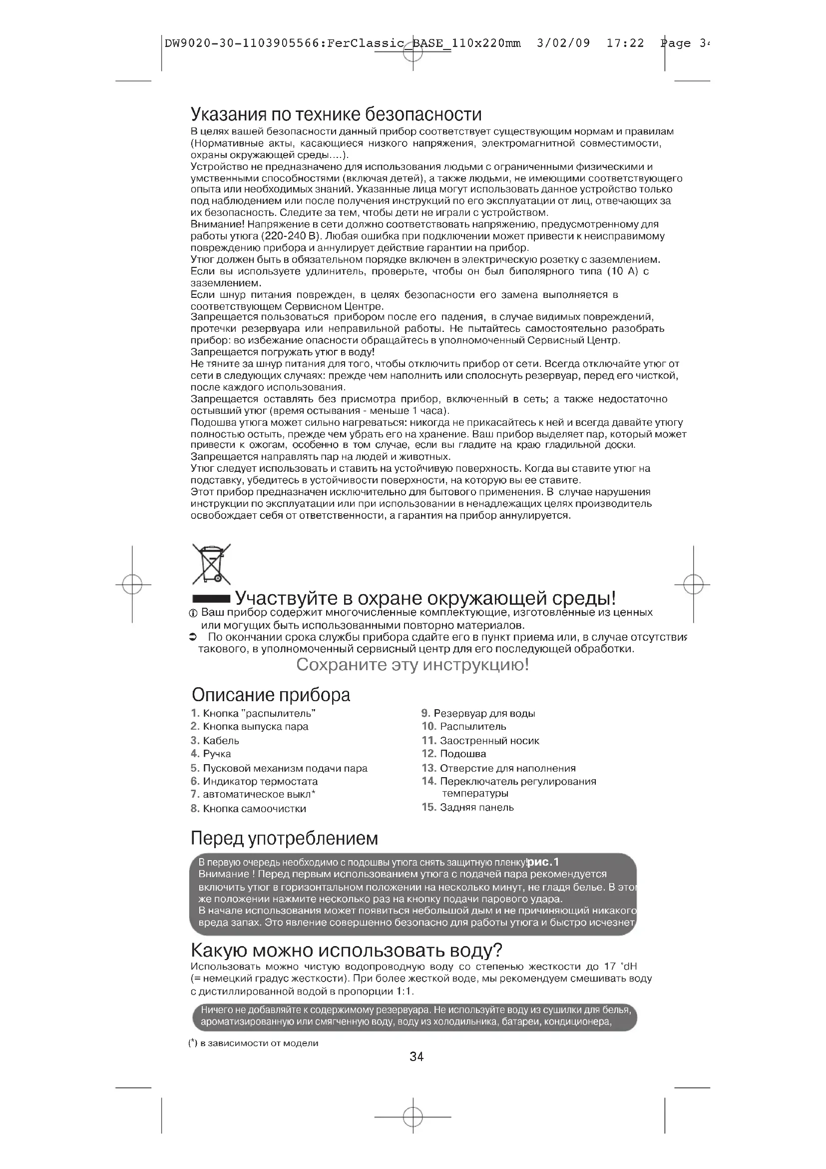 - ÙÌÔ‡. ∞Ê‹ÓÂÙ ϛÁÔ ÌÂÁ·Ï‡ÙÂÚÔ ¯ÚÔÓÈÎfi ‰È¿ÛÙËÌ· ·Ó¿ÌÂÛ· Û ‰‡Ô ·Ù‹Ì·Ù· ¤ÍÙÚ· ÔÛfiÙËÙ·˜ ·ÙÌÔ‡. ∏ ıÂÚÌÔÎÚ·Û›· Ù˘ Ͽη˜ Â›Ó·È Ôχ ¯·ÌËÏ‹. ƒ˘ıÌ›ÛÙ ÙÔ Û›‰ÂÚÔ Û ˘„ËÏfiÙÂÚË ıÂÚÌÔÎÚ·Û›·. DW9020-30-1103905566:FerClassic_BASE_110x220mm 3/02/09 17:22 Page 3334 В целях вашей безопасности данный прибор соответствует существующим нормам и правилам(Нормативные акты, касающиеся низкого напряжения, электромагнитной совместимости,охраны окружающей среды….).Устройство не предназначено для использования людьми с ограниченными физическими иумственными способностями (включая детей), а также людьми, не имеющими соответствующегоопыта или необходимых знаний. Указанные лица могут использовать данное устройство толькопод наблюдением или после получения инструкций по его эксплуатации от лиц, отвечающих заих безопасность. Следите за тем, чтобы дети не играли с устройством.Внимание! Напряжение в сети должно соответствовать напряжению, предусмотренному дляработы утюга (220-240 В). Любая ошибка при подключении может привести к неисправимомуповреждению прибора и аннулирует действие гарантии на прибор.Утюг должен быть в обязательном порядке включен в электрическую розетку с заземлением.Если вы используете удлинитель, проверьте, чтобы он был биполярного типа (10 A) сзаземлением.Если шнур питания поврежден, в целях безопасности его замена выполняется всоответствующем Сервисном Центре.Запрещается пользоваться прибором после его падения, в случае видимых повреждений,протечки резервуара или неправильной работы. Не пытайтесь самостоятельно разобратьприбор: во избежание опасности обращайтесь в уполномоченный Сервисный Центр.Запрещается погружать утюг в воду!Не тяните за шнур питания для того, чтобы отключить прибор от сети. Всегда отключайте утюг отсети в следующих случаях: прежде чем наполнить или сполоснуть резервуар, перед его чисткой,после каждого использования. Запрещается оставлять без присмотра прибор, включенный в сеть; а также недостаточноостывший утюг (время остывания - меньше 1 часа).Подошва утюга может сильно нагреваться: никогда не прикасайтесь к ней и всегда давайте утюгуполностью остыть, прежде чем убрать его на хранение. Ваш прибор выделяет пар, который может привести к ожогам, особенно в том случае, если вы гладите на краю гладильной доски. Запрещается направлять пар на людей и животных.Утюг следует использовать и ставить на устойчивую поверхность. Когда вы ставите утюг наподставку, убедитесь в устойчивости поверхности, на которую вы ее ставите.Этот прибор предназначен исключительно для бытового применения. В случае нарушенияинструкции по эксплуатации или при использовании в ненадлежащих целях производительосвобождает себя от ответственности, а гарантия на прибор аннулируется. Описание прибора Использовать можно чистую водопроводную воду со степенью жесткости до 17 °dH (= немецкий градус жесткости). При более жесткой воде, мы рекомендуем смешивать водус дистиллированной водой в пропорции 1:1.В первую очередь необходимо с подошвы утюга снять защитную пленку! рис.1 Внимание ! Перед первым использованием утюга с подачей пара рекомендуетсявключить утюг в горизонтальном положении на несколько минут, не гладя белье. В этомже положении нажмите несколько раз на кнопку подачи парового удара.В начале использования может появиться небольшой дым и не причиняю